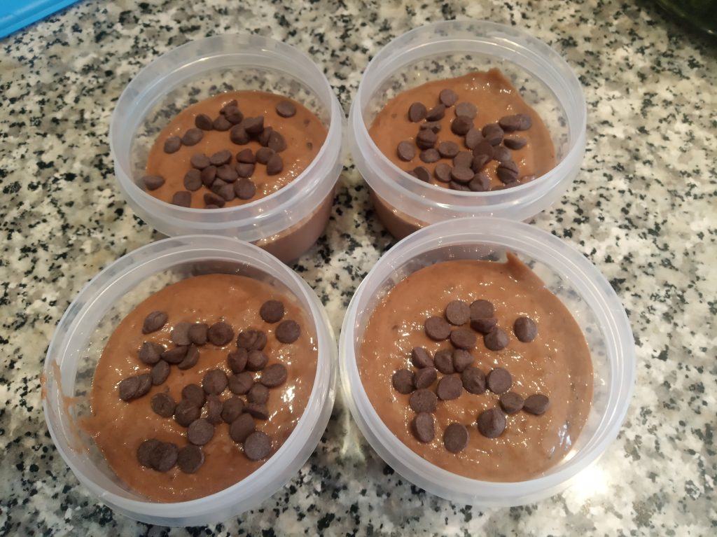 Luego lo repartes en 4 táper, vasos, lo que tengas, reparte por encima perlitas de chocolate, lo puedes meter en el frigorífico, para que cuaje un poco y tomarlo fresquito, o congelarlos, estos acuérdate sacarlos antes de consumirlo, para que no este muy duro.