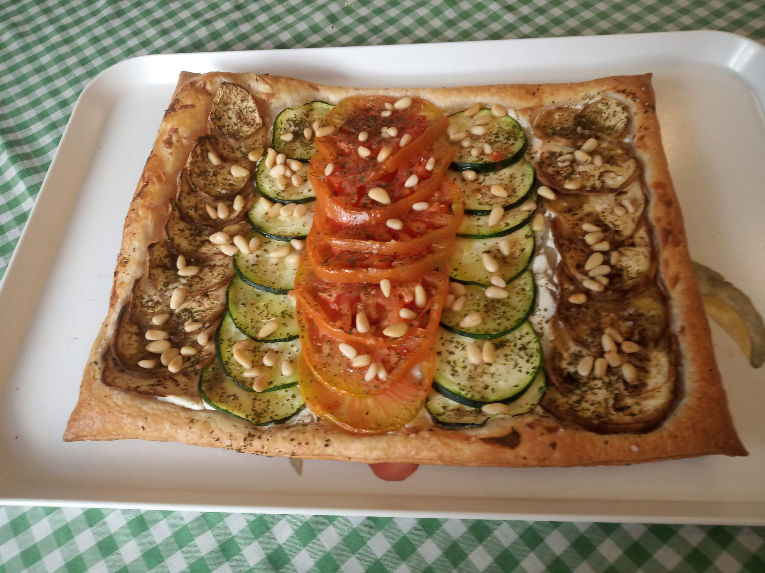 Por último, pelamos la berenjena, y cortamos también en rodajitas y colocamos en la parte central. Echamos a las verduras un poco de sal y pimienta, repartimos los piñones por encima, y una cucharada de aceite. Si quieres puedes echarle otras hierbas aromáticas, que tengas y te guste.