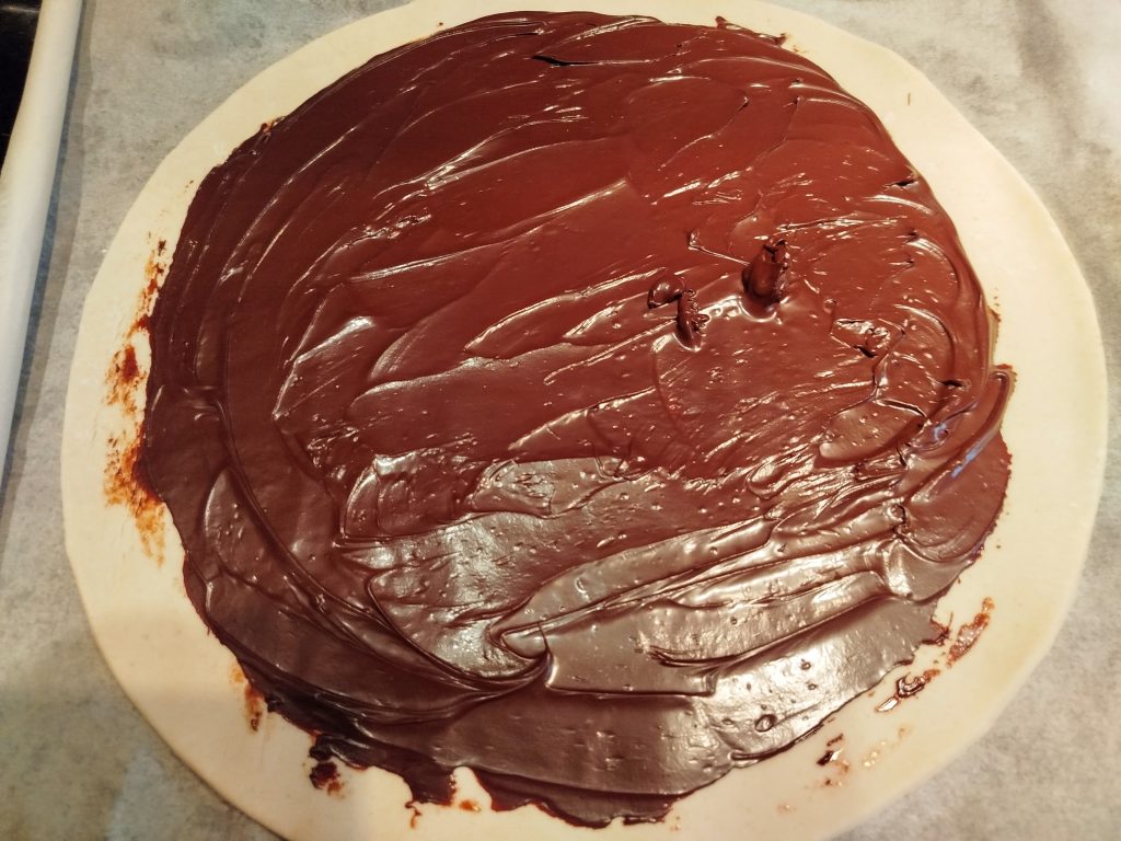 Echamos montoncitos de la crema de chocolate, y la extendemos, sin llegar a los filos.