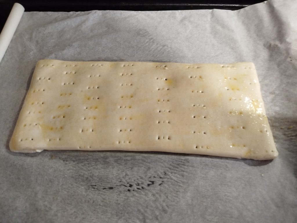 Cerramos bien los filos con los dedos, y un tenedor, pinchamos por encima con el tenedor, para que no suba, y la pintamos por encima, yo tenía zumo con un poco de bebida de soja, para tomar, y lo hice con eso, mojar el papel de horno con las manos mojadas, porque suele quemarse mucho, no es como el que venden.