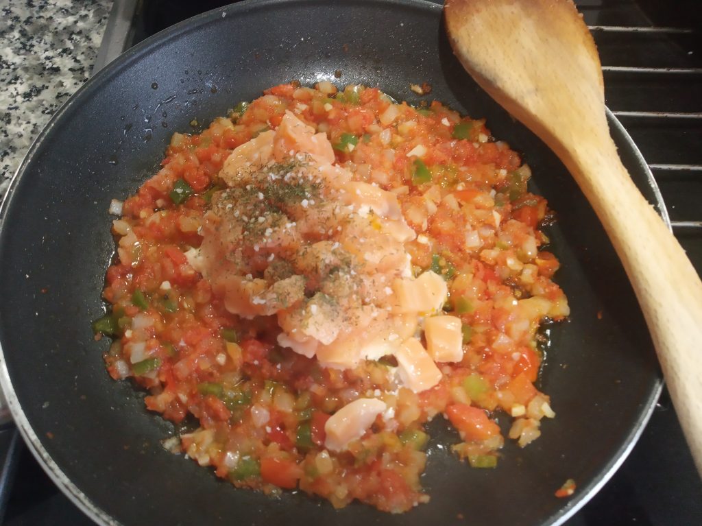 Trocear el salmón en taquitos pequeños, antes supervisar que esta limpio de espinas y no tiene piel, si tuviera quitárselo antes, arrastrando el cuchillo, por debajo pegado a la piel.