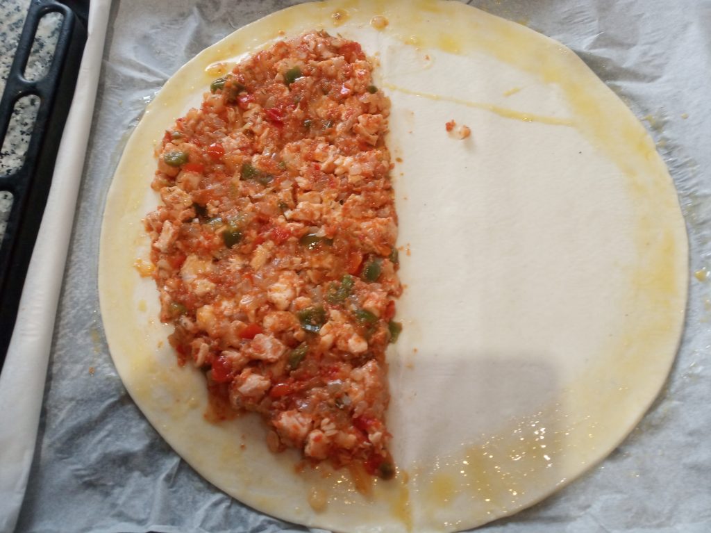 Poner la otra mitad de la masa de hojaldre encima, y plegar los bordes.
