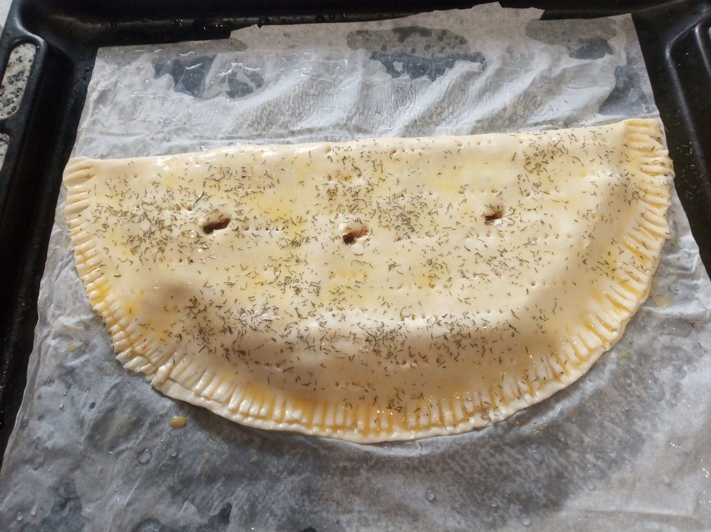 Batir el huevo y con un pincel, pintar todo el hojaldre hasta los bordes, y decorar con eneldo picado.