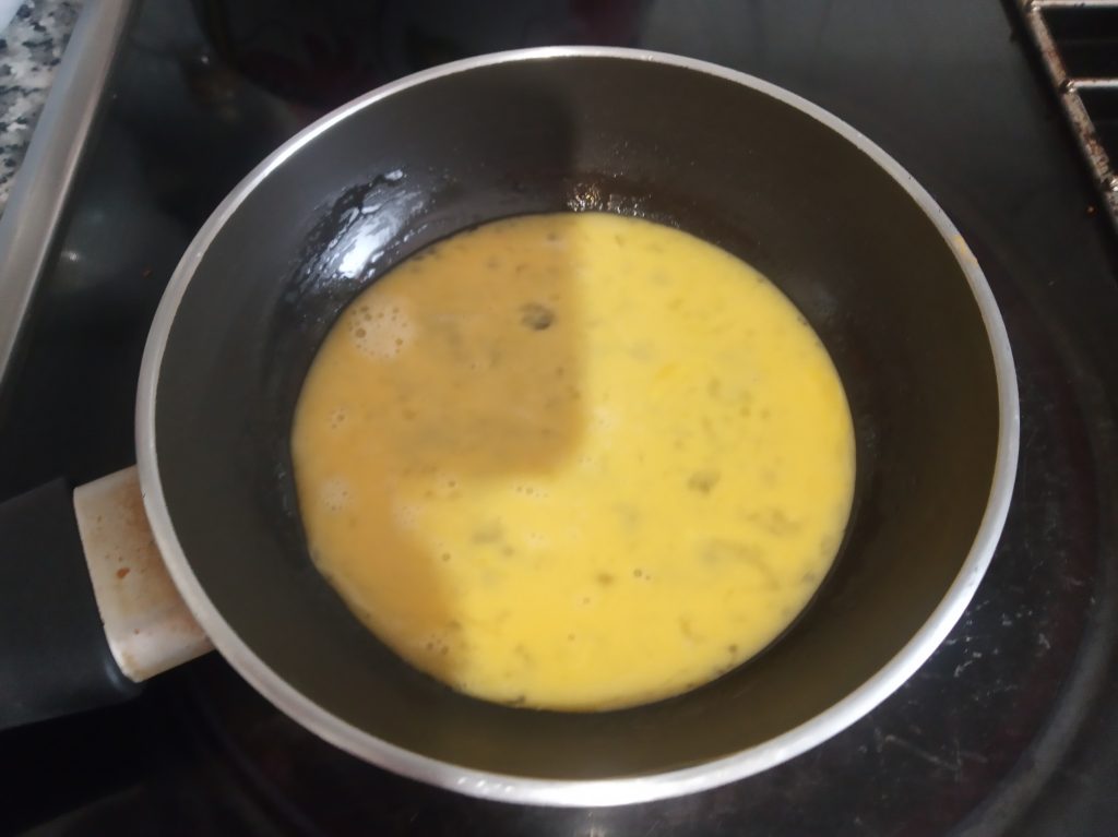 Echar el preparado en la sarten, sin aceite escurriéndolo bien, sobre la mitad de la masa de hojaldre, repartido bien, sin llegar a los filos.