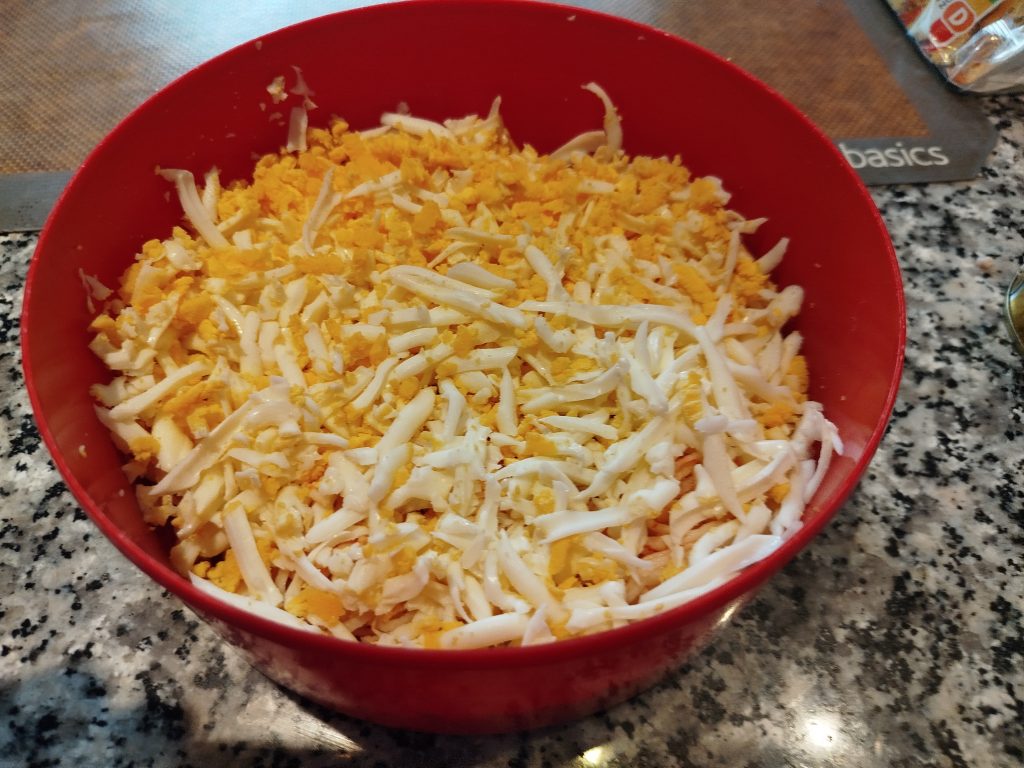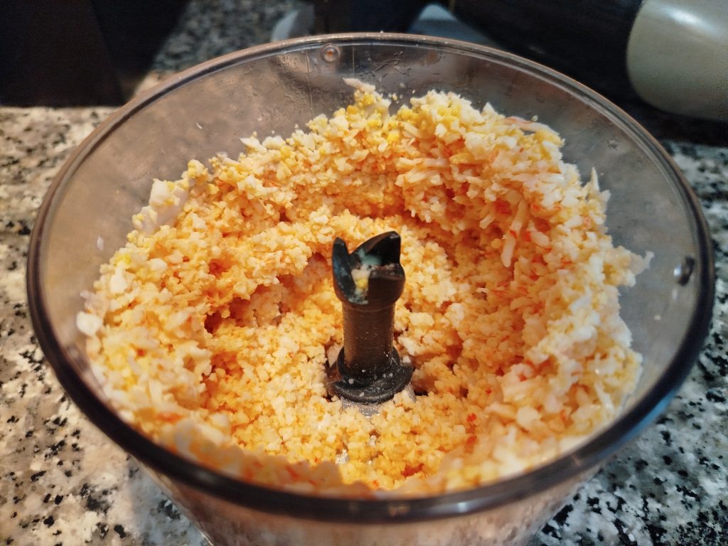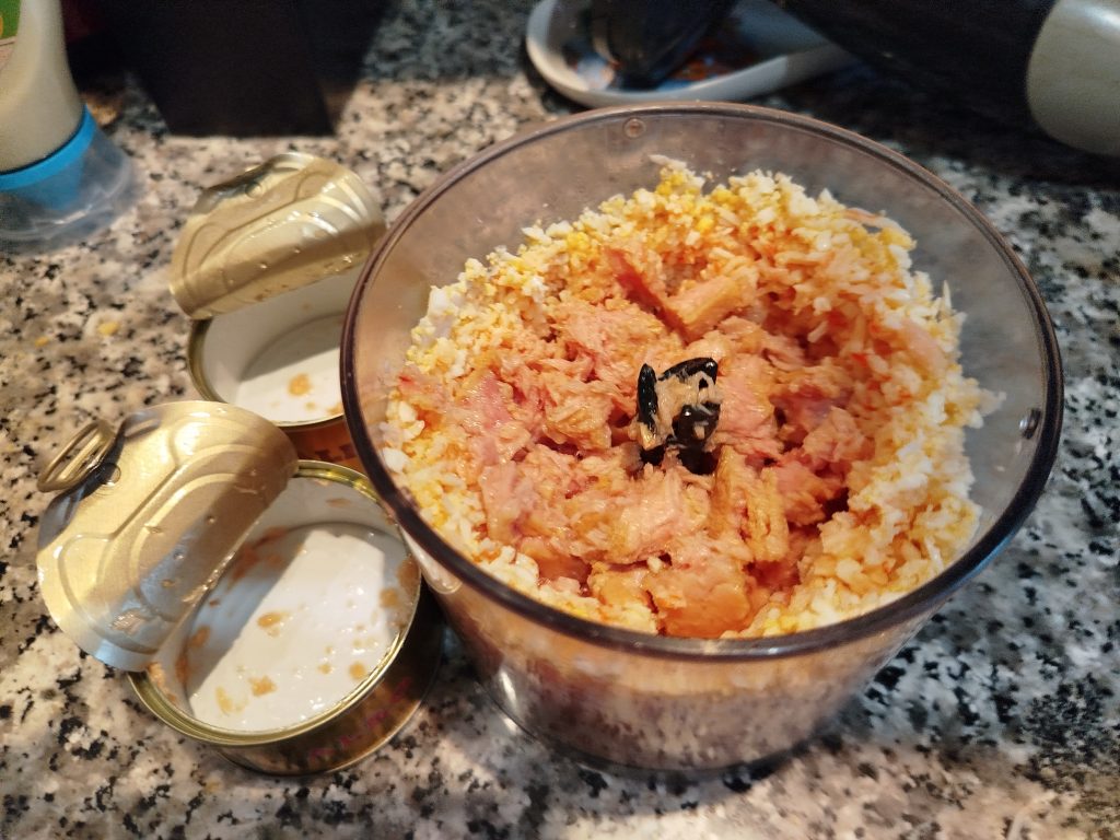 Esta vez no utilice la picadora, eche en un bol el surimi rallado, el huevo duro rallado y el atún escurrido y desmenuzado, tres cucharadas de mayonesa, lo mezcle todo muy bien.