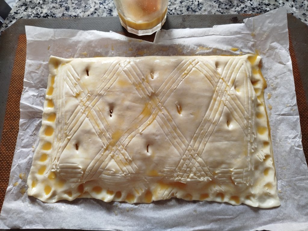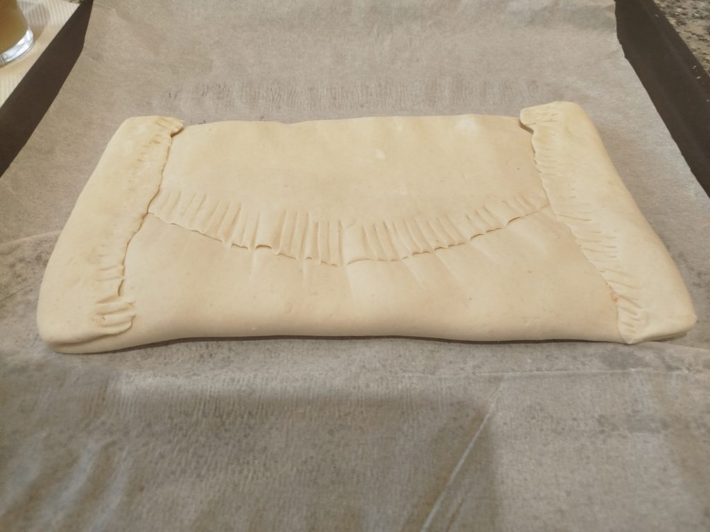 Extendí la masa de hojaldre rectangular, rellene la mitad, sin llegar a los filos, y la cerré muy bien, pintar con huevo batido, hacer un dibujo con el tenedor y perforar varias veces, para que salga el vapor.