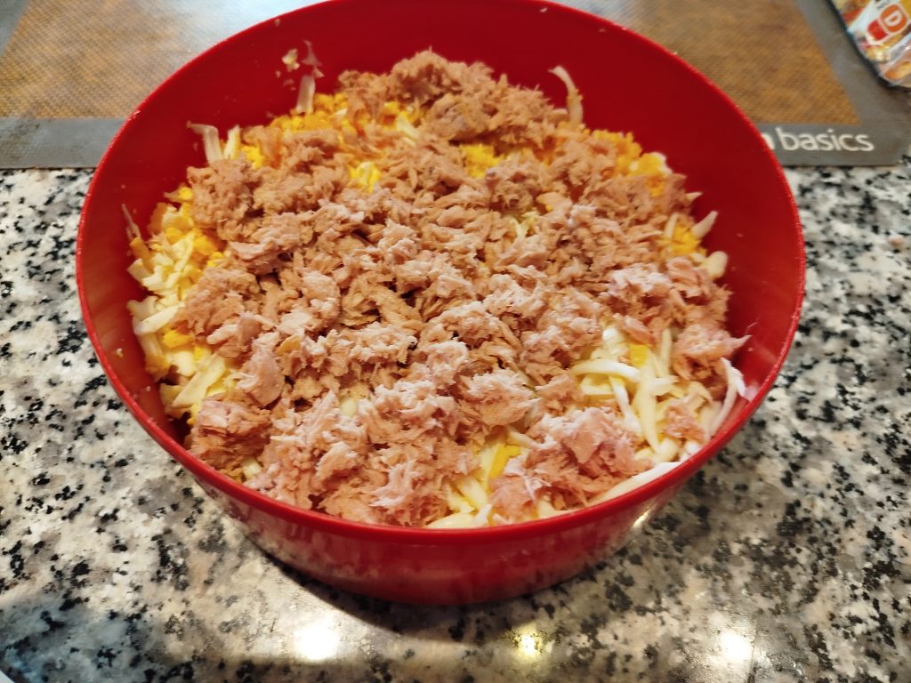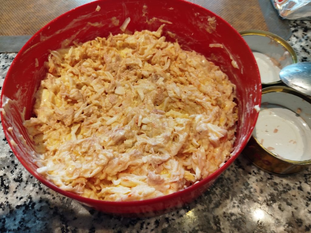 Luego añadir el surimi rallado, y por ultimo el atún escurrido.