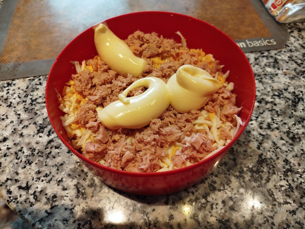 Añadir mayonesa, y terminar de mezclar todo, probar por si hace falta más mayonesa.