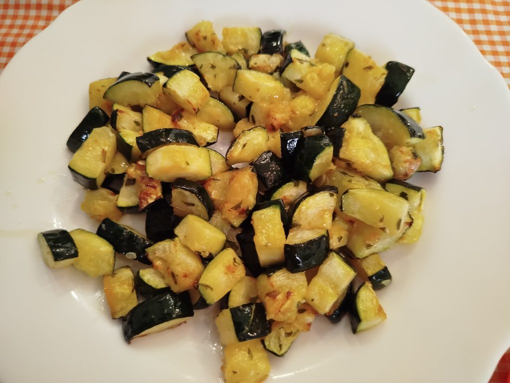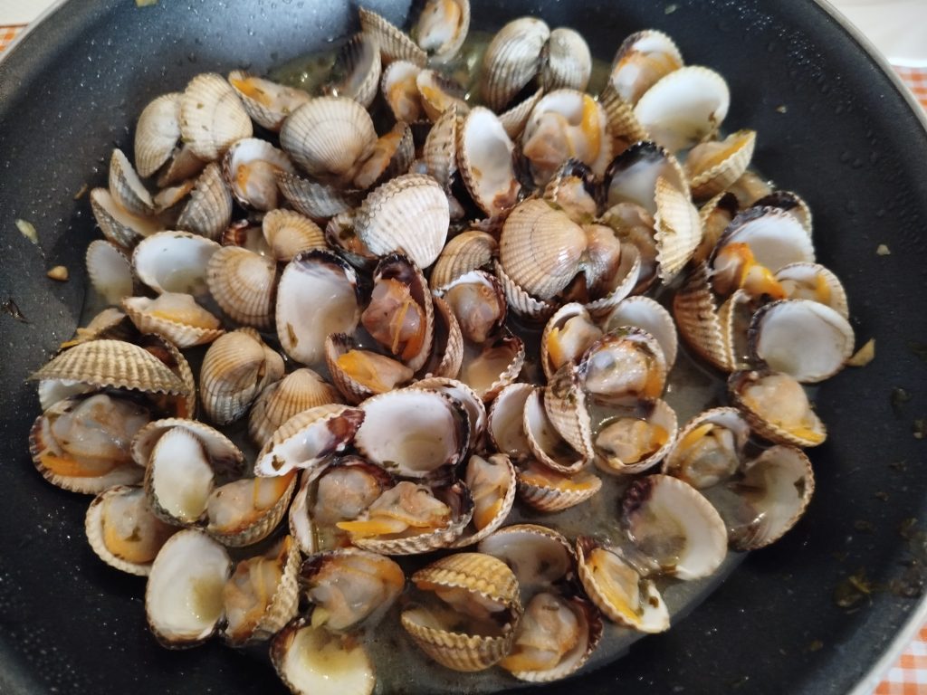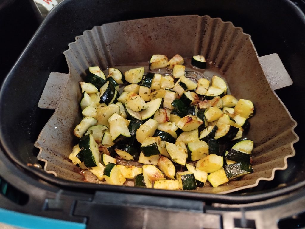 Esta vez la acompañe de Berberechos al vapor con vino y un Calabacín troceado, poner en el cestillo de la freidora de aire, y añadir un poco de sal, ajo de bote, aceite, etc. y hacer hasta que este tierno.