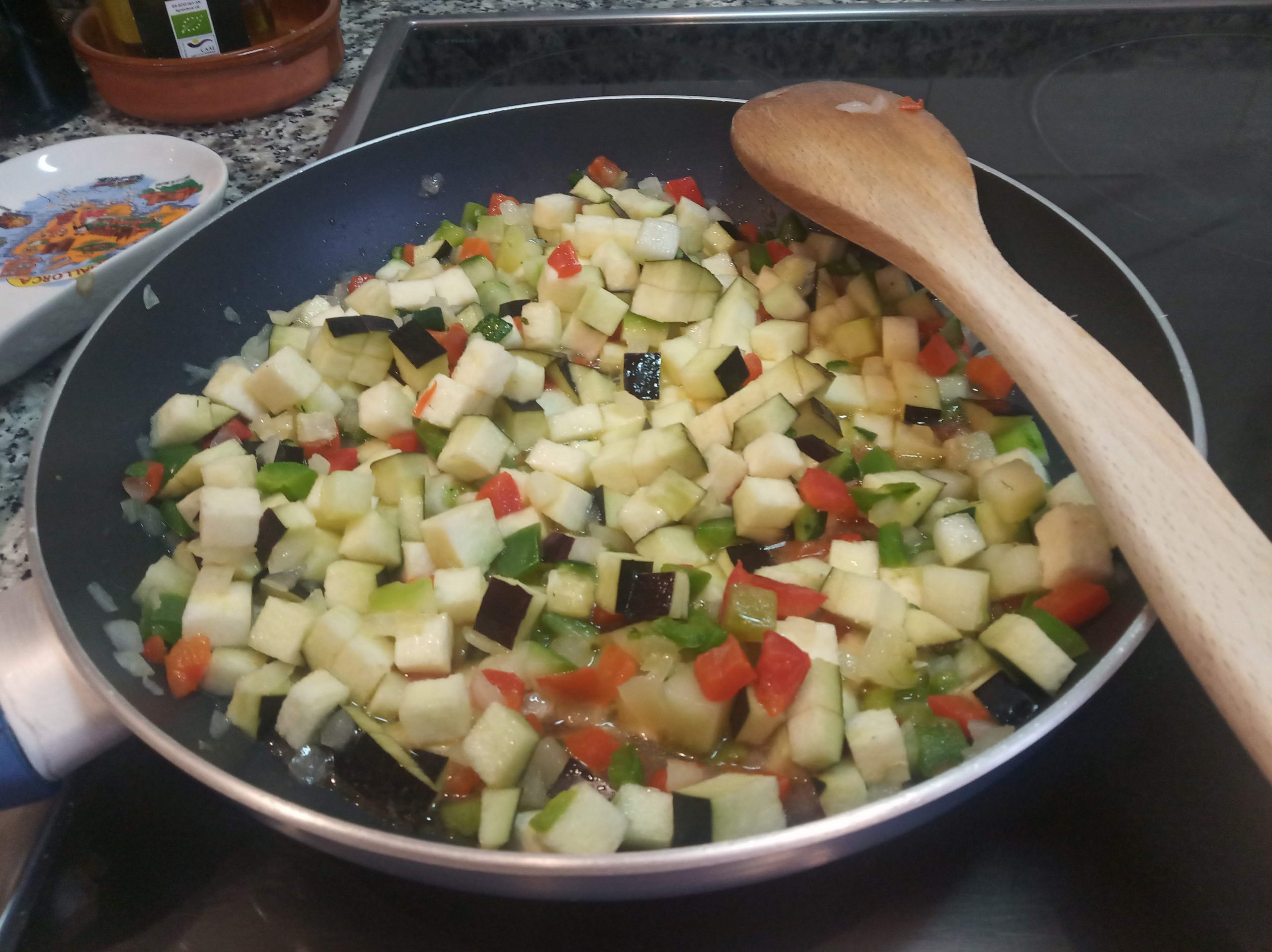 Si son fresca, cortar todas en trocitos pequeños. Echar aceite en la sartén y sofreír con un poco de sal y pimienta, durante unos 15 minutos, hasta que la verdura esta tierna.