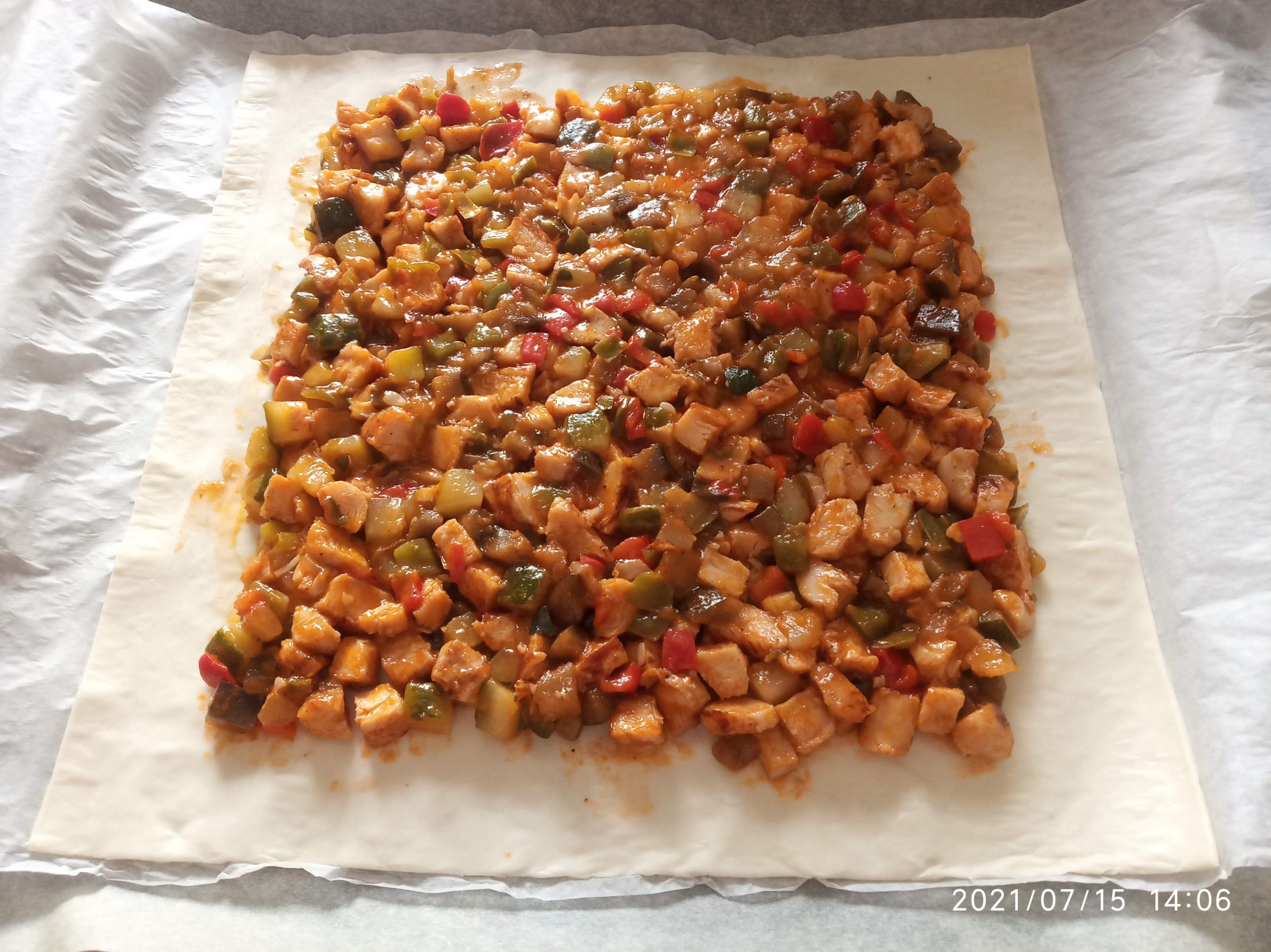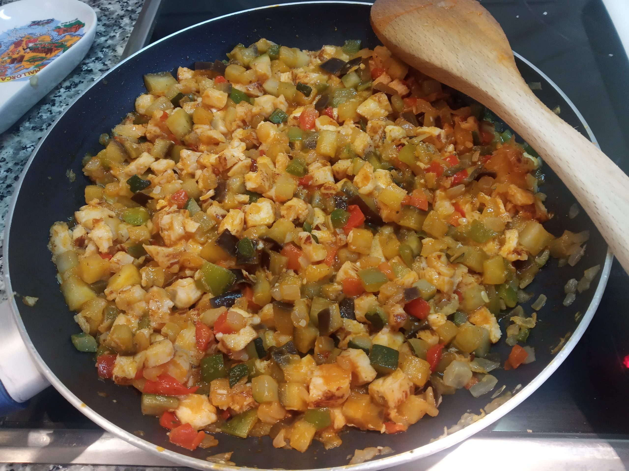 Si el pollo es fresco, cortar también en trozos pequeños echar un poco de sal, y añadir al sofrito y dejar hasta que este hecho. Si esta ya hecho solo tenéis que mezclarlo todo muy bien.