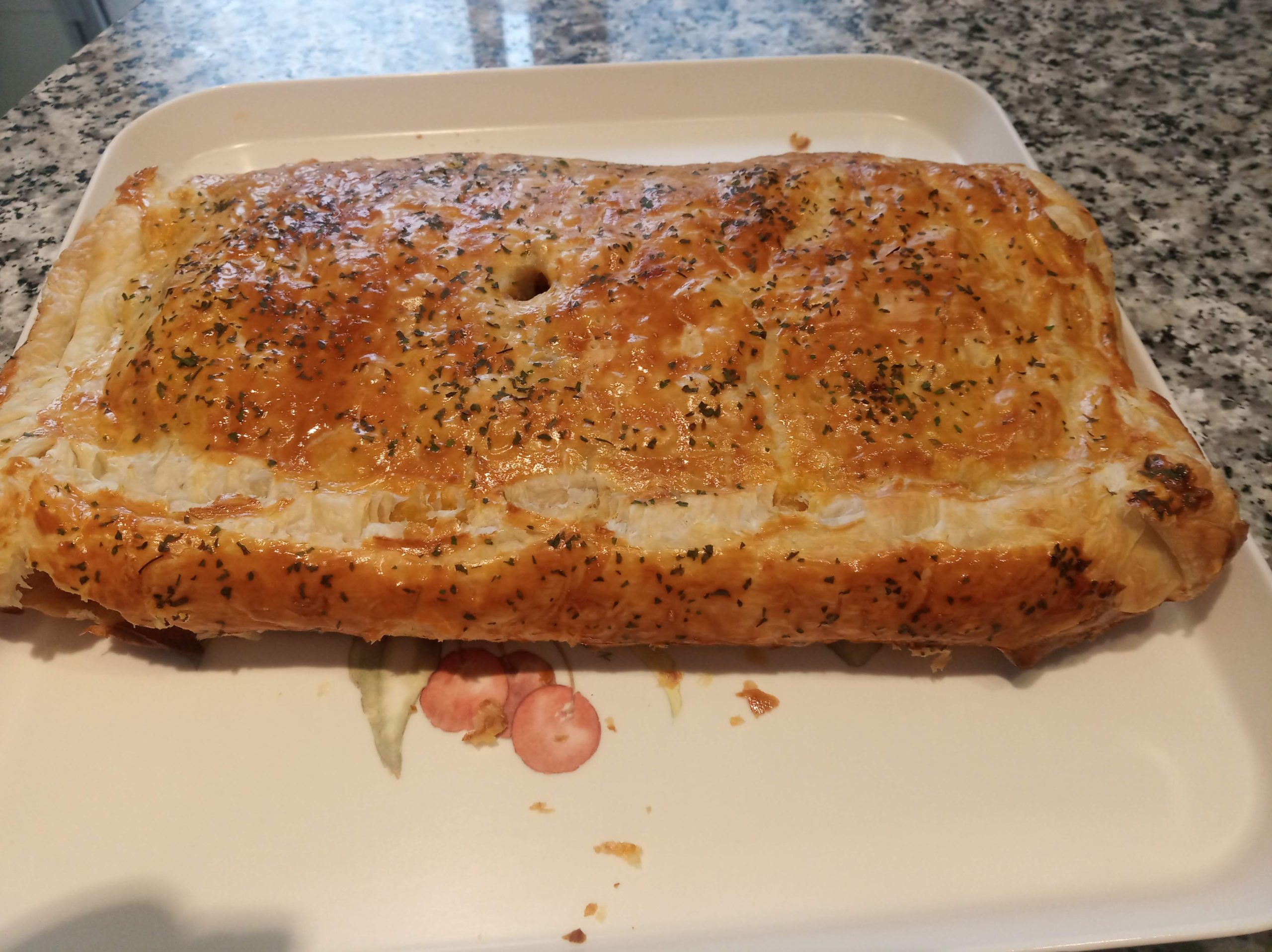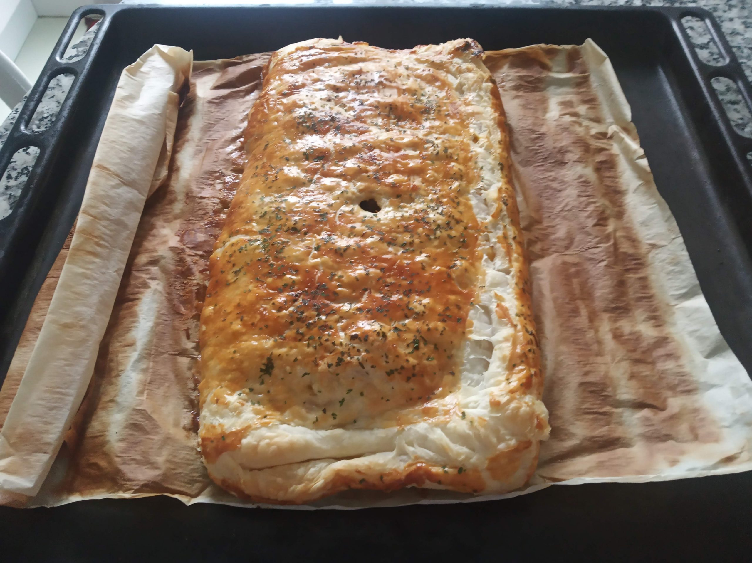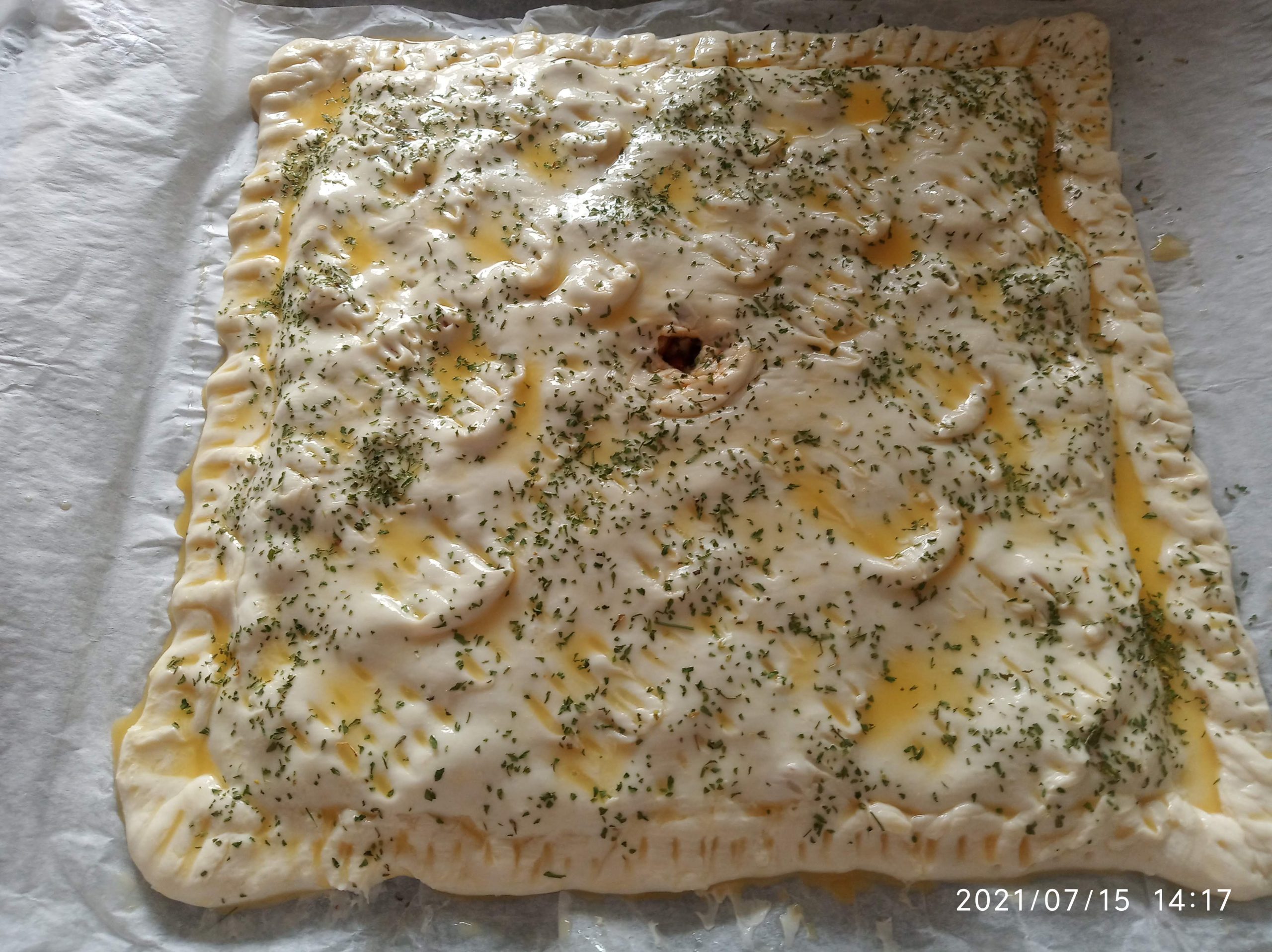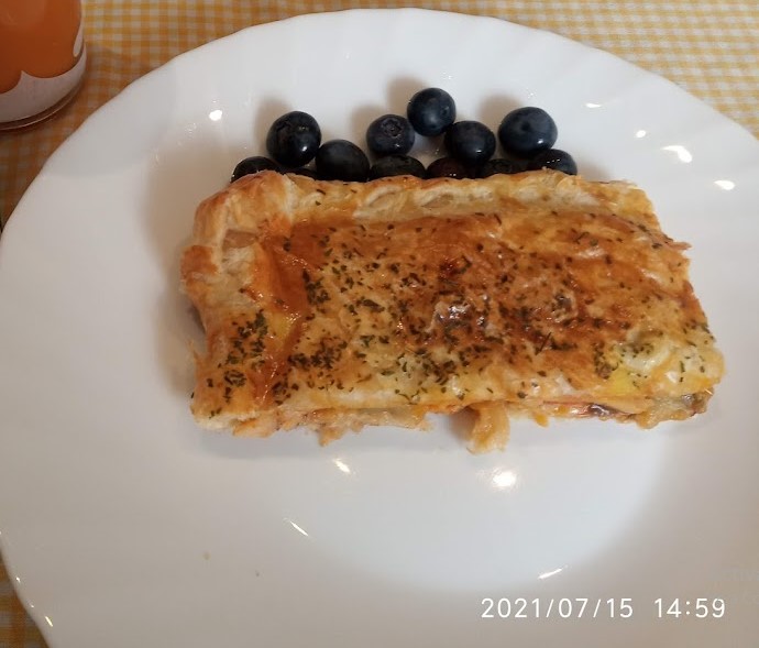Dejo abajo las imágenes, donde utilice dos masas de hojaldre entera y queda más plana y fácil de comer.