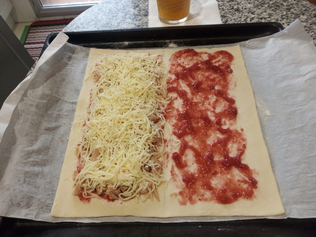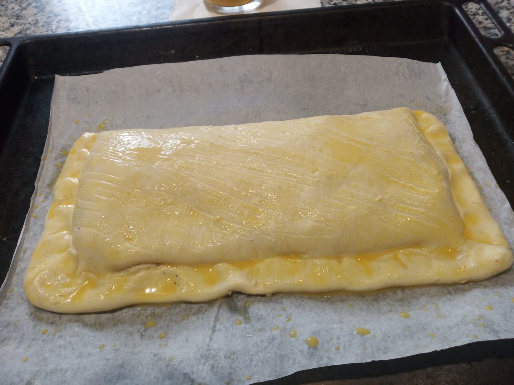 Cerrar el Hojaldre, con la otra mitad, y pichar con un tenedor, para que no suba, y cerrar muy bien los bordes con pliegues.