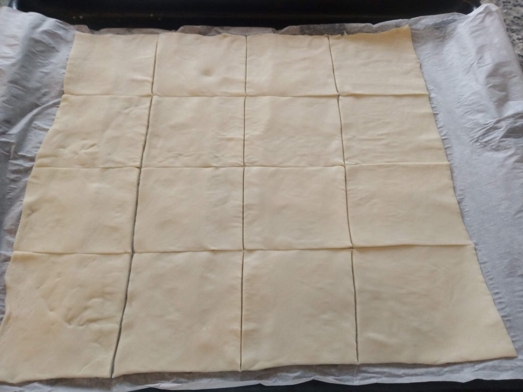 Estiramos la masa de hojaldre en su mismo papel, sobre la placa de horno.