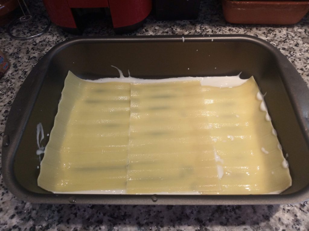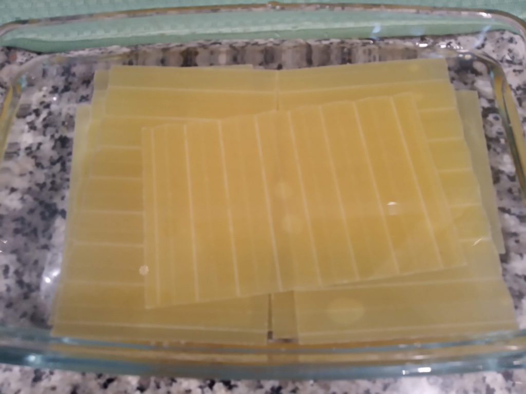 Poner 9 placas de lasaña precocidas cruzadas en un bol, para hidratarla, el tiempo que indica el paquete o hasta que termines de hacer el relleno.