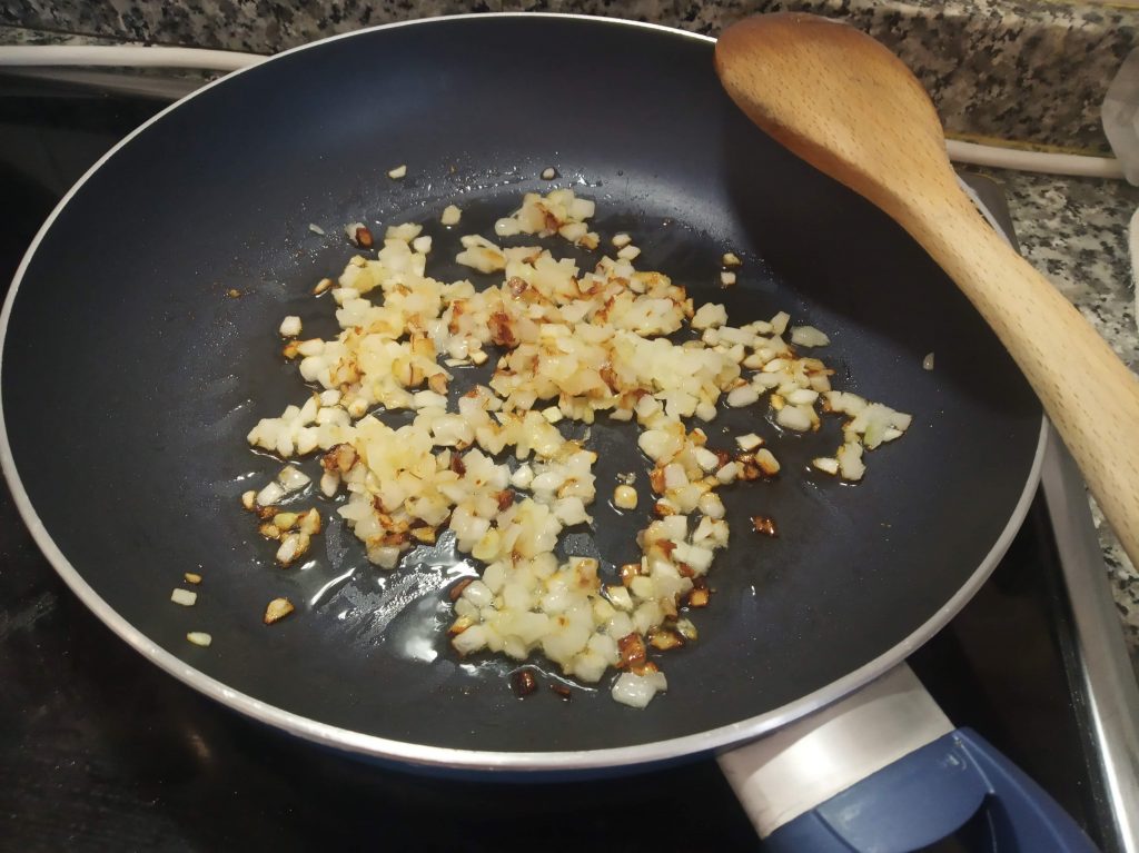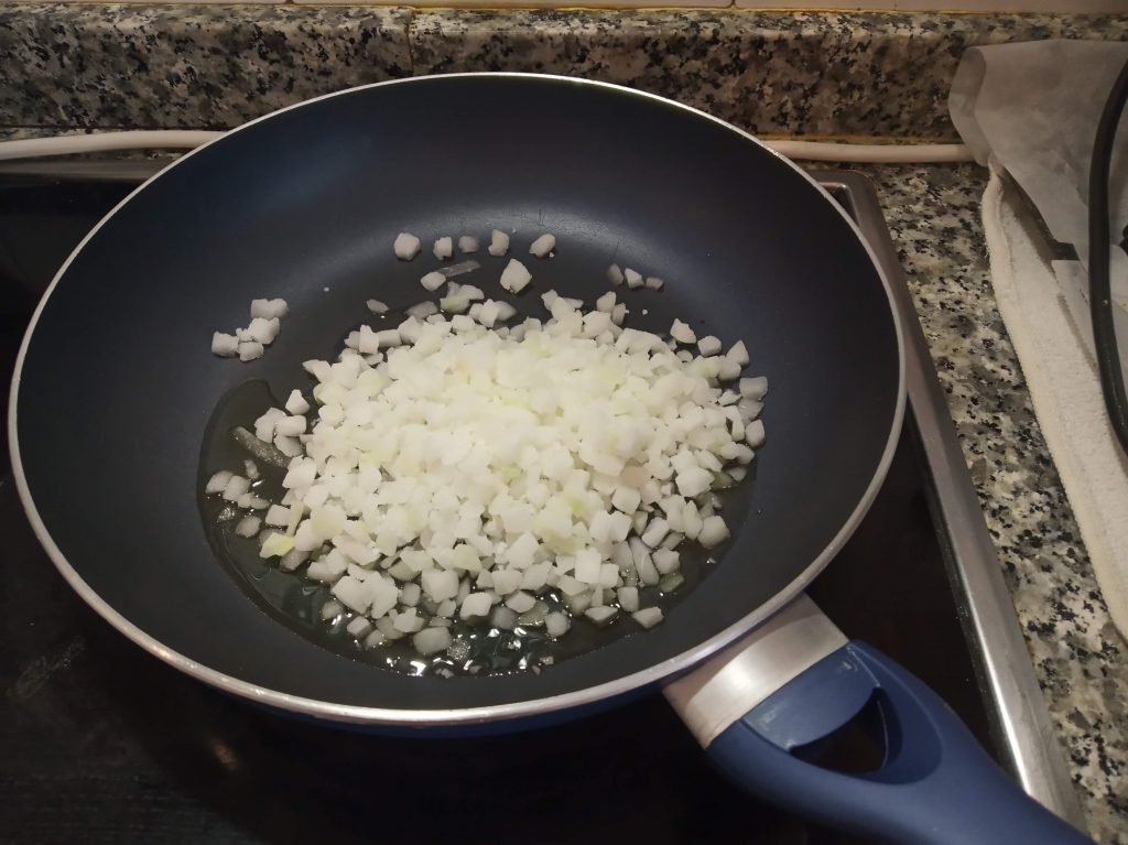 En una sarten echamos un poco de aceite y la cebolla troceada con un poco de sal, sofreír y apagar la candela.