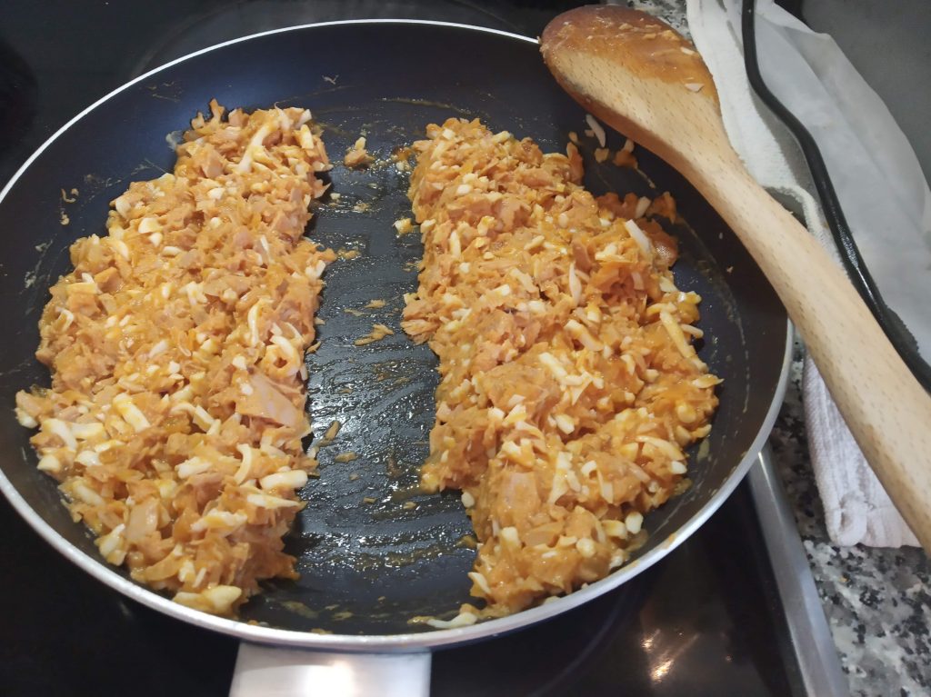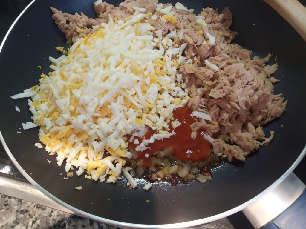 Le añadimos el atún desmenuzado y escurrido, los huevos cocidos rallados, el tomate frito (reservar un poco) y lo mezclamos todo muy bien.