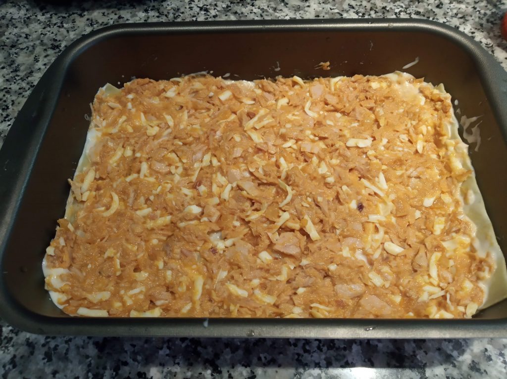 Colocamos 3 placas, echamos la mitad del relleno y otras 3 placas encimas, con un poco de bechamel y la extendemos.