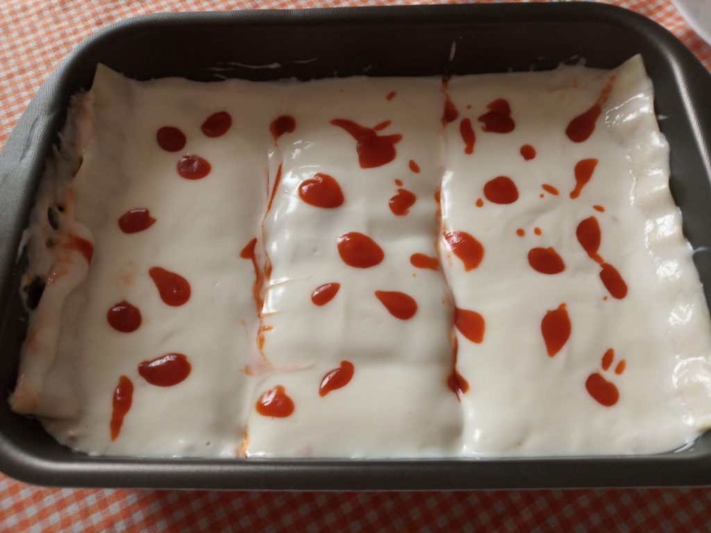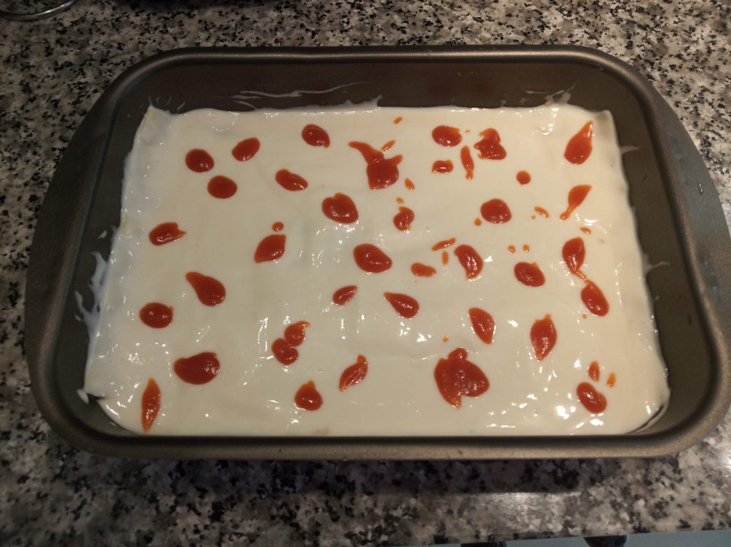 Repartir el resto de bechamel por encima, cubriendo todo muy bien, y decorar haciendo puntitos con el resto de tomate frito.