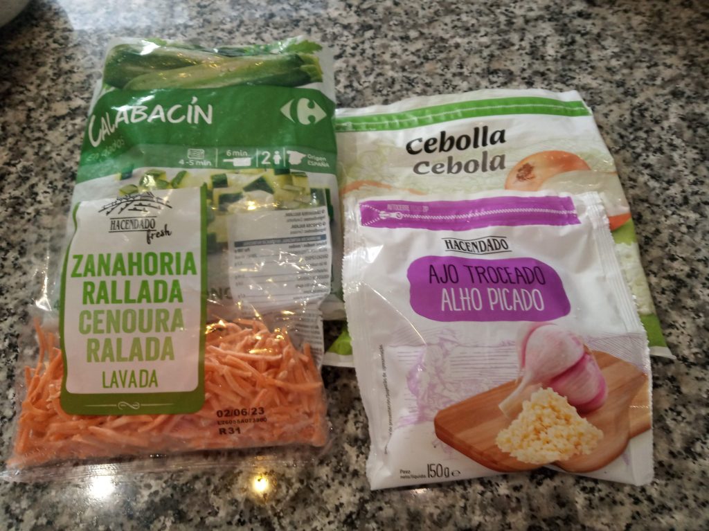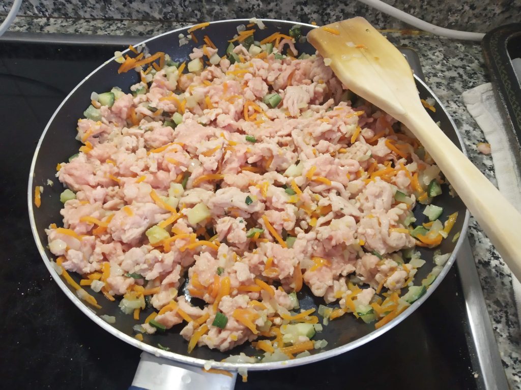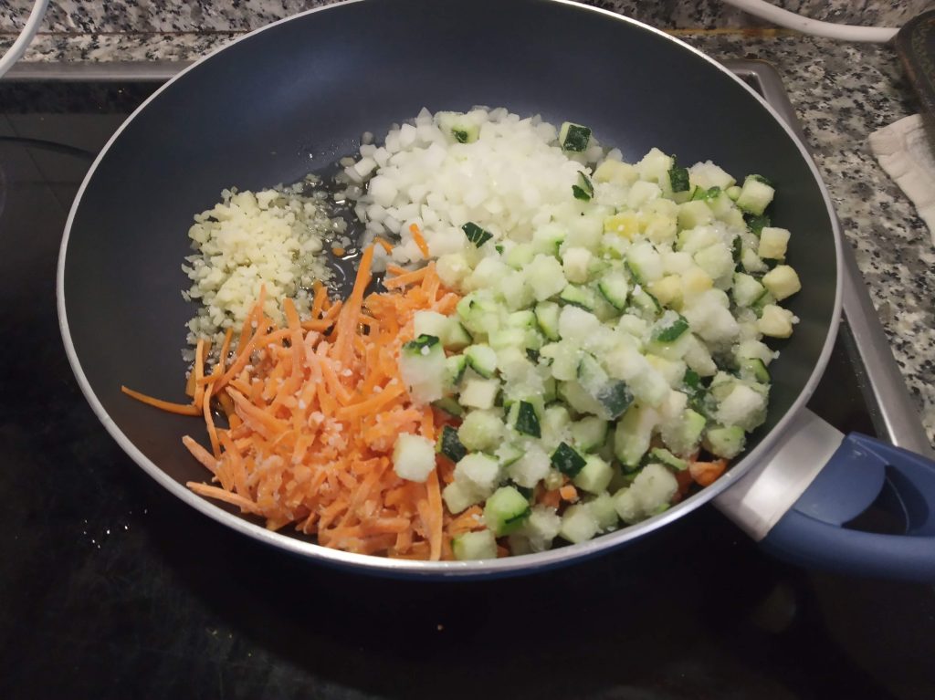 Después en una sarten echamos un poco de aceite, y las verduras picadas frescas o congeladas, con un poco de sal, dejar haciéndose unos 10 minutos.