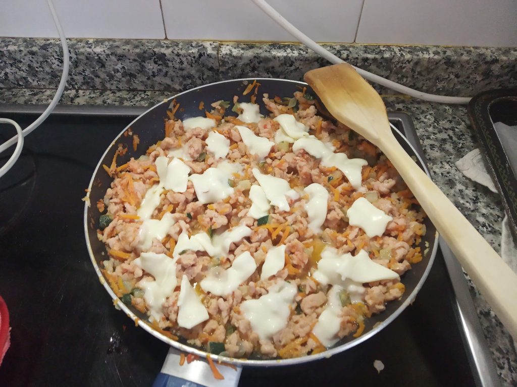 Repetimos con otras 3 placas, relleno y queso rallado, reservando el ultimo tercio para el final.