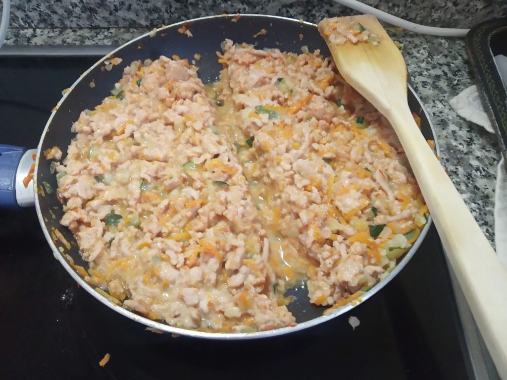 Solo tenía 3 lonchas de tranchetes, y se la eche a trocitos, mover muy bien, hasta que quede todo bien ligado. Reservar