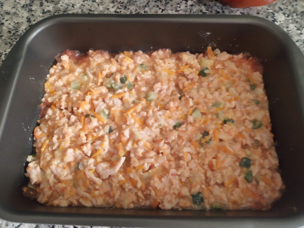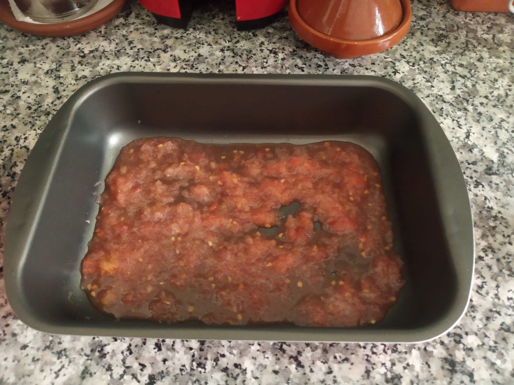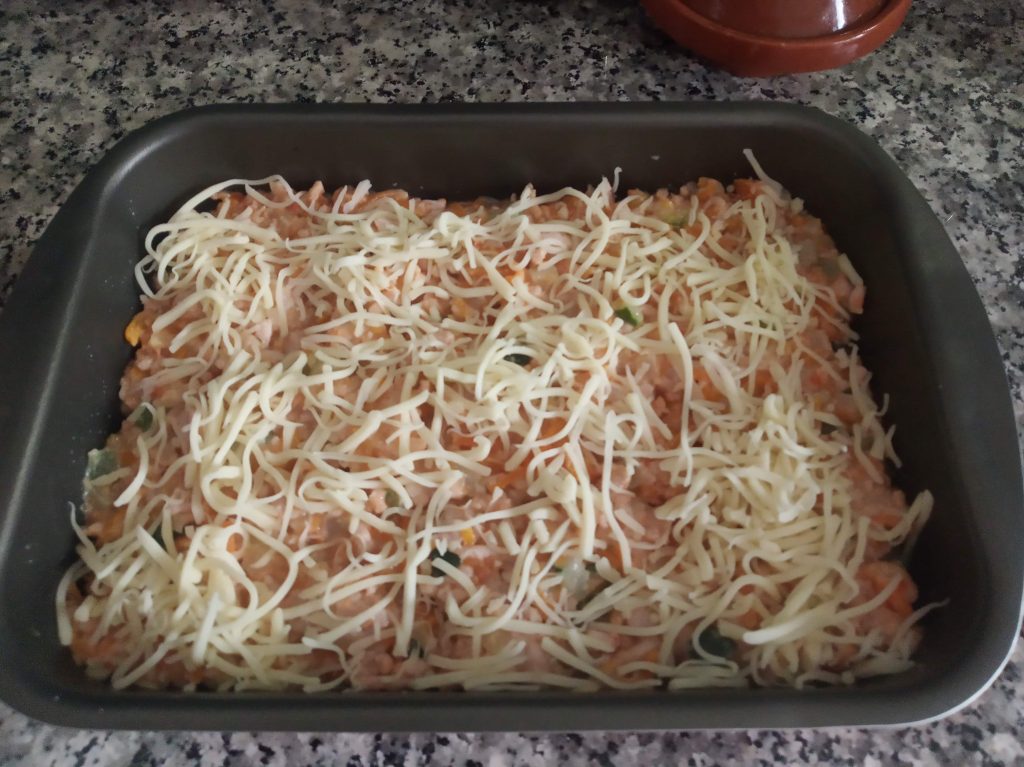 Meter la bandeja en el horno, elegir solo arriba para gratinar al máximo 250ºC, durante unos 15 minutos. Ir observándolo, no todos los hornos son iguales, hasta que quede doradito por arriba.