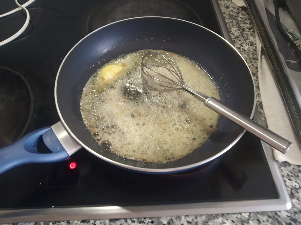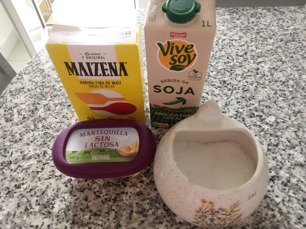 Hacemos la bechamel, en mi caso al ser de Maicena, la disuelvo en la leche fría, echamos en una sarten la mantequilla, con un poco de aceite si quieres, le añadimos la mezcla de soja y maicena, y remover con unas varillas, hasta que espese, yo le eche solo 400 ml y salió muy espesa, puedes echarle 500 ml para que quede un poco más ligera.