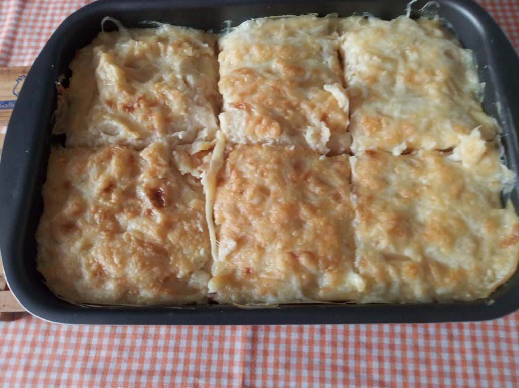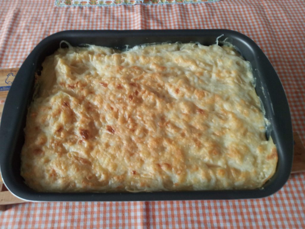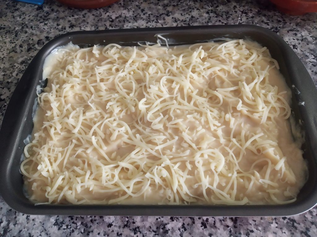 Colocar las 3 ultimas placas de lasaña, echar por encima la bechamel, y espolvorear con el último tercio de queso rallado que teníamos reservado.