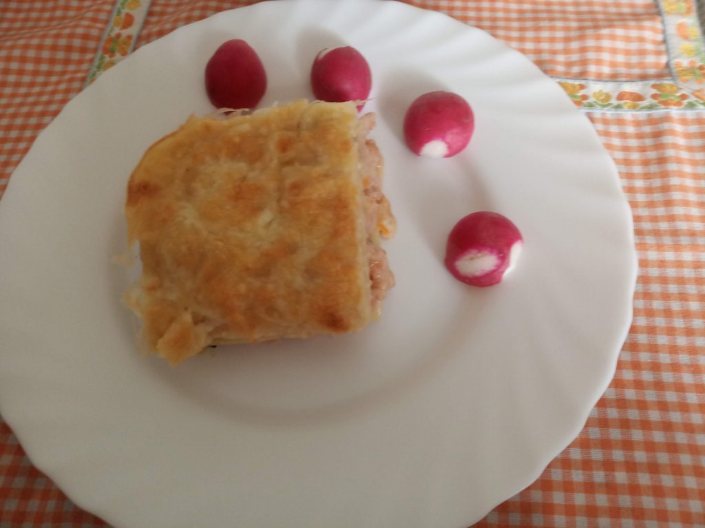 Echamos en la bandeja, el tomate rallado en el fondo, colocar 3 placas de lasaña, la mitad del relleno y 1/3 del queso rallado.
