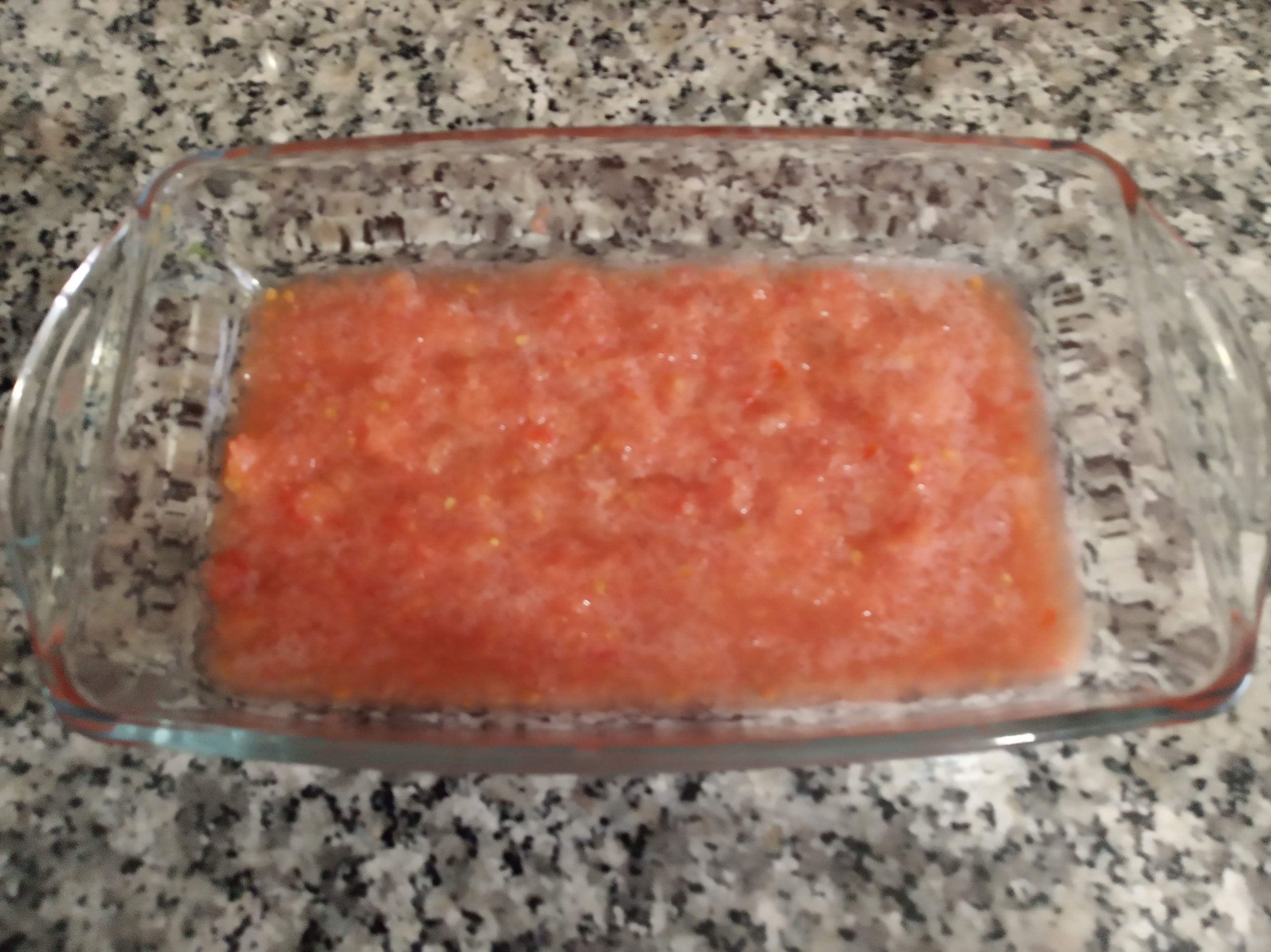 Echamos en la bandeja, el tomate rallado en el fondo, colocar 3 placas de lasaña, la mitad del relleno y 1/3 del queso rallado.
