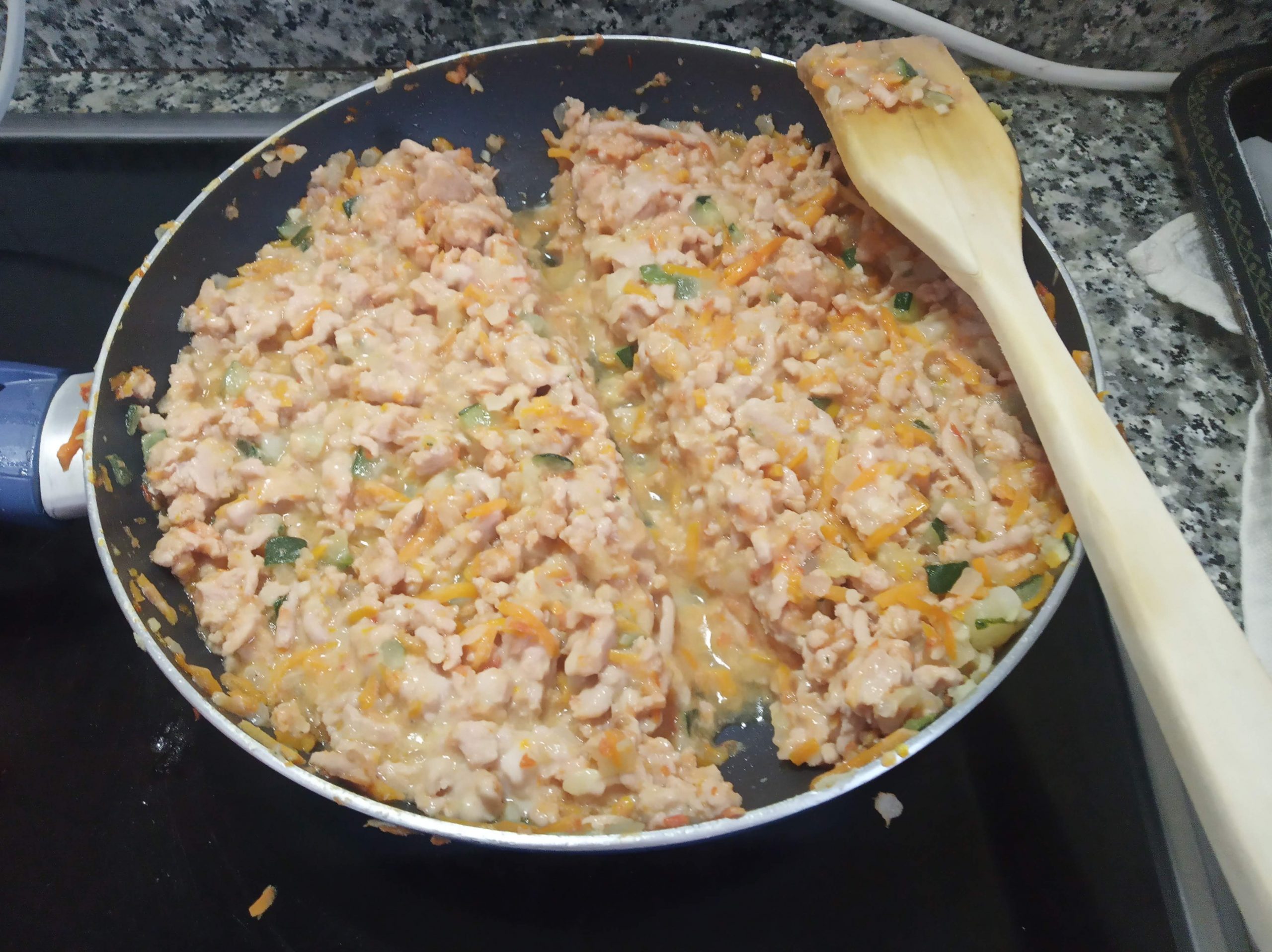 Solo tenía 3 lonchas de tranchetes, y se la eche a trocitos, mover muy bien, hasta que quede todo bien ligado. Reservar
