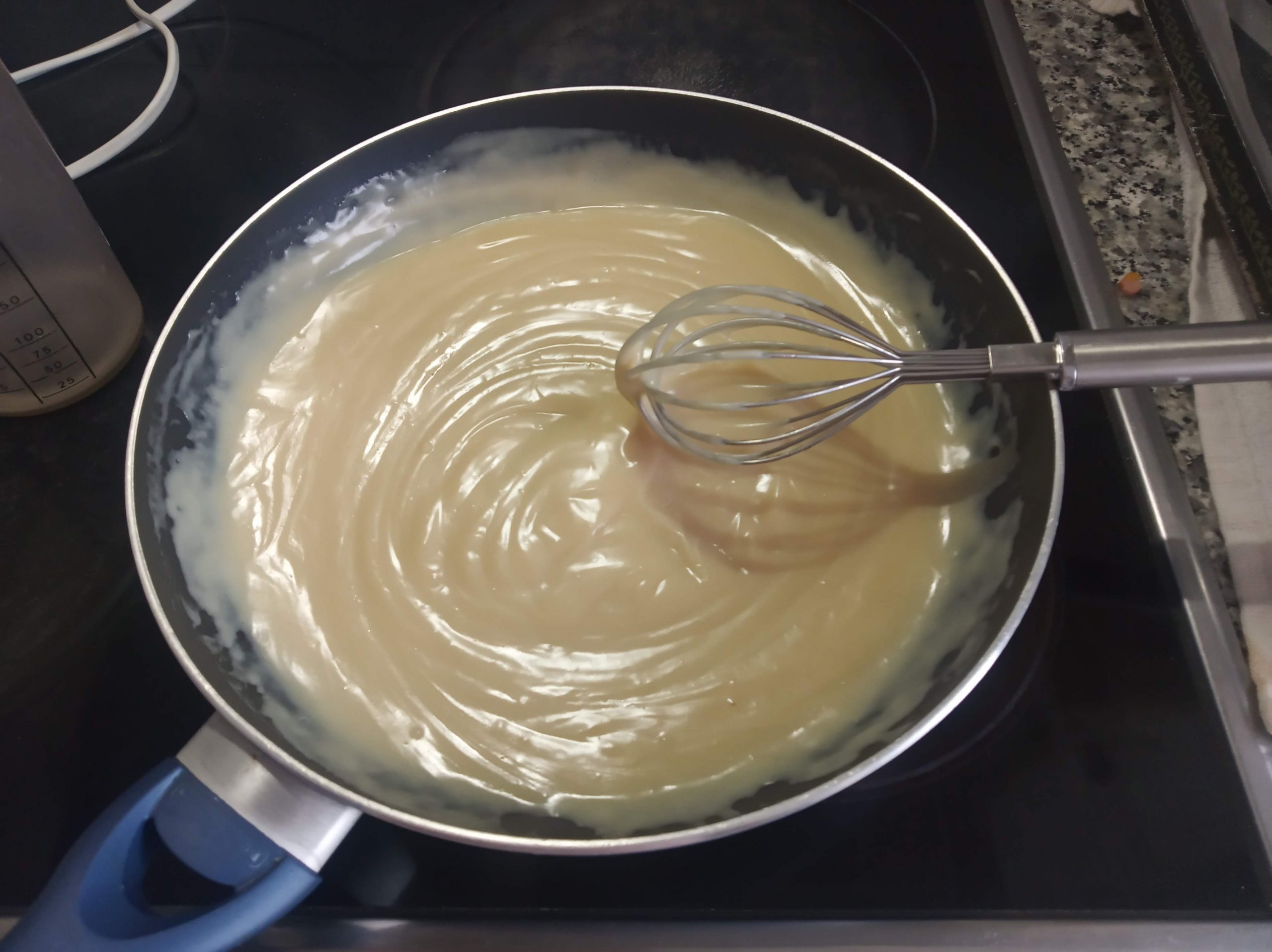 Hacemos la bechamel, en mi caso al ser de Maicena, la disuelvo en la leche fría, echamos en una sarten la mantequilla, con un poco de aceite si quieres, le añadimos la mezcla de soja y maicena, y remover con unas varillas, hasta que espese, yo le eche solo 400 ml y salió muy espesa, puedes echarle 500 ml para que quede un poco más ligera.