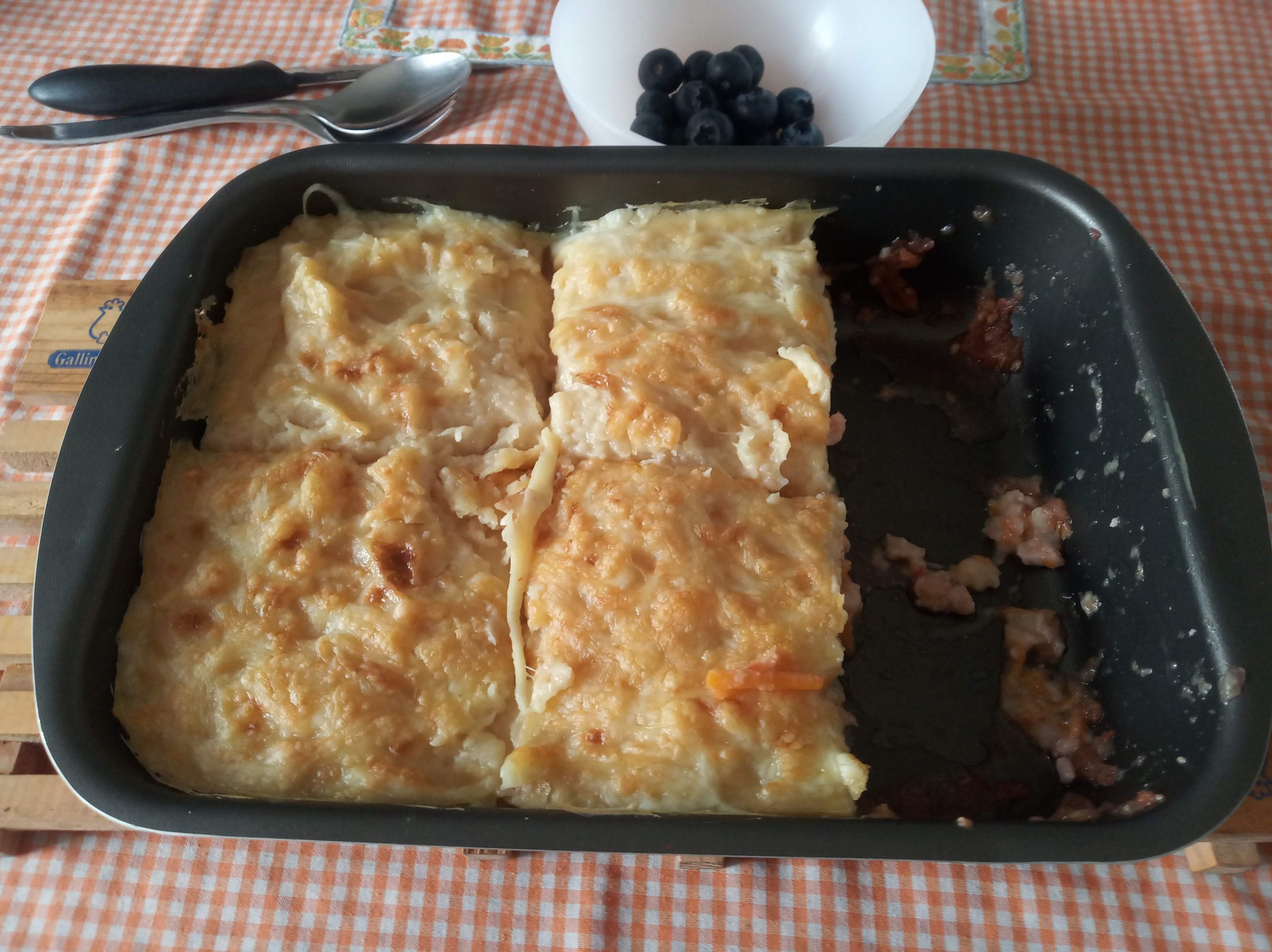 Colocar las 3 ultimas placas de lasaña, echar por encima la bechamel, y espolvorear con el último tercio de queso rallado que teníamos reservado.