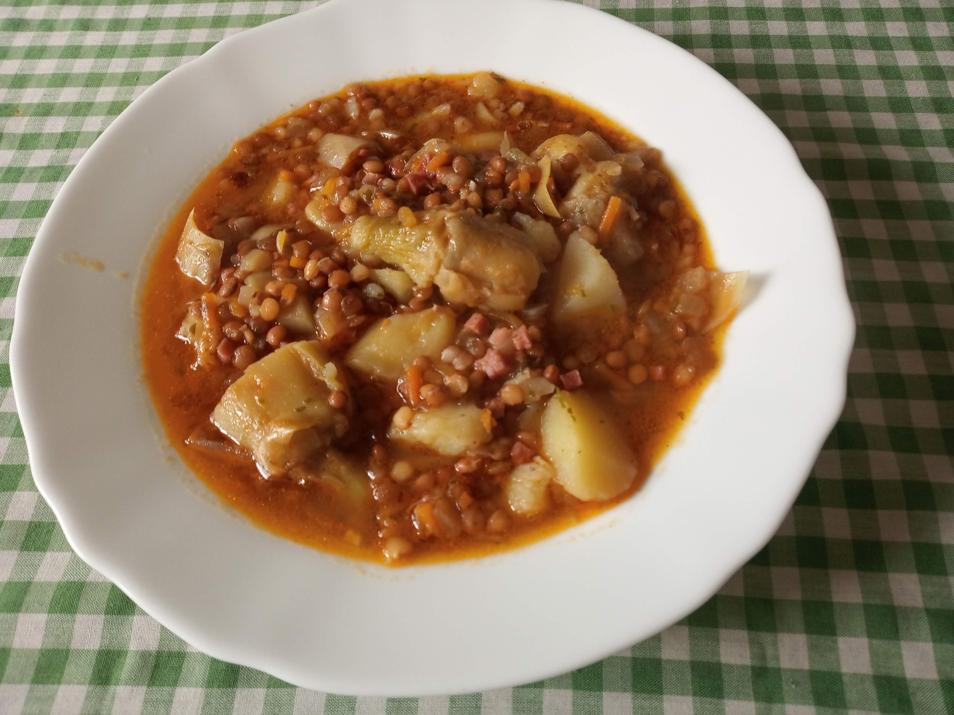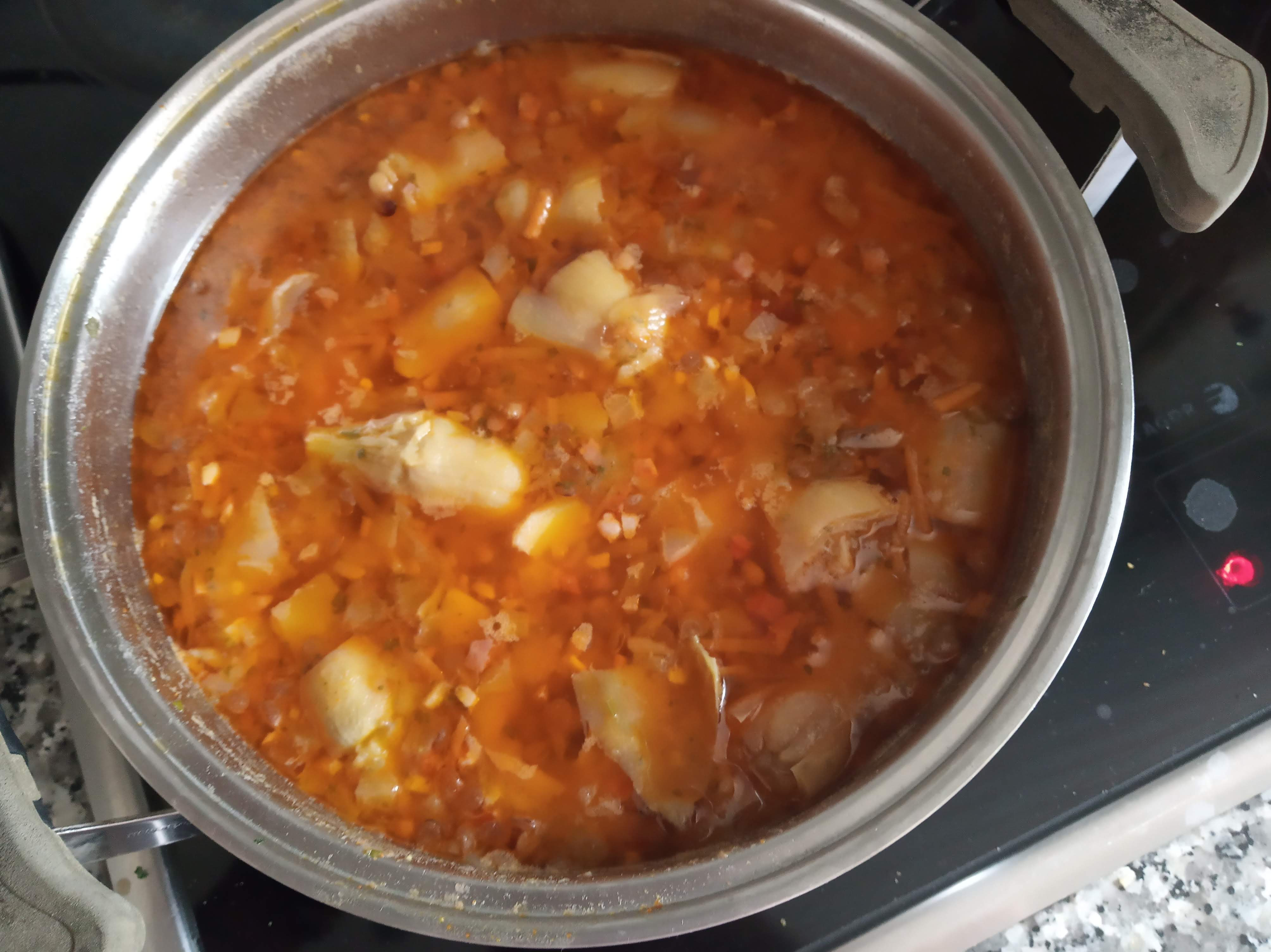 Añadimos las patatas chasqueadas, los corazones de alcachofas, los tacos de jamón, las lentejas, el laurel, pimienta, comino, pimentón dulce y la pastilla de caldo desmenuzada, cubrimos con agua y dejamos cocer a fuego lento durante 20 minutos.