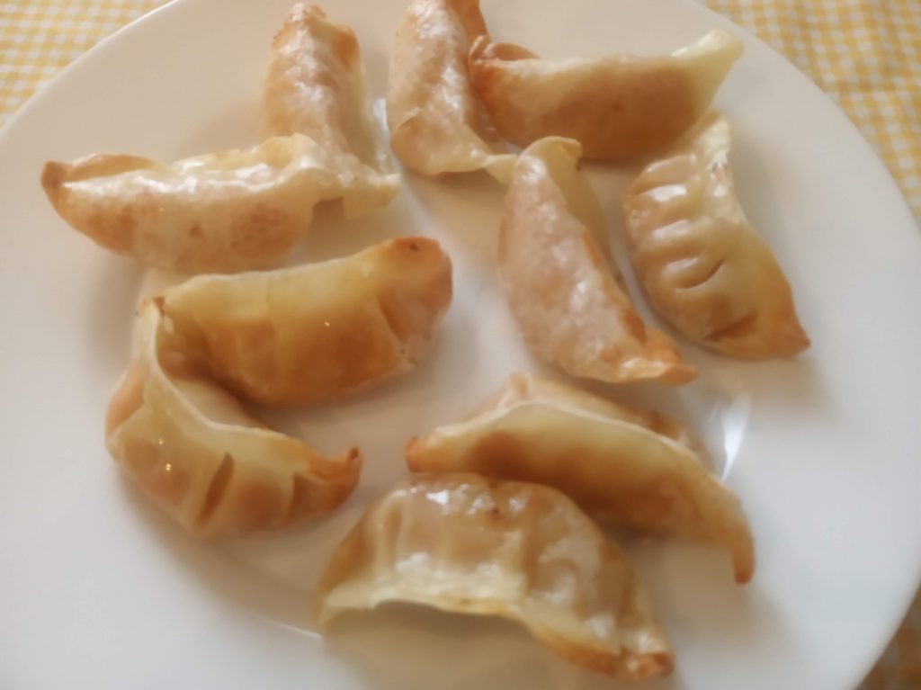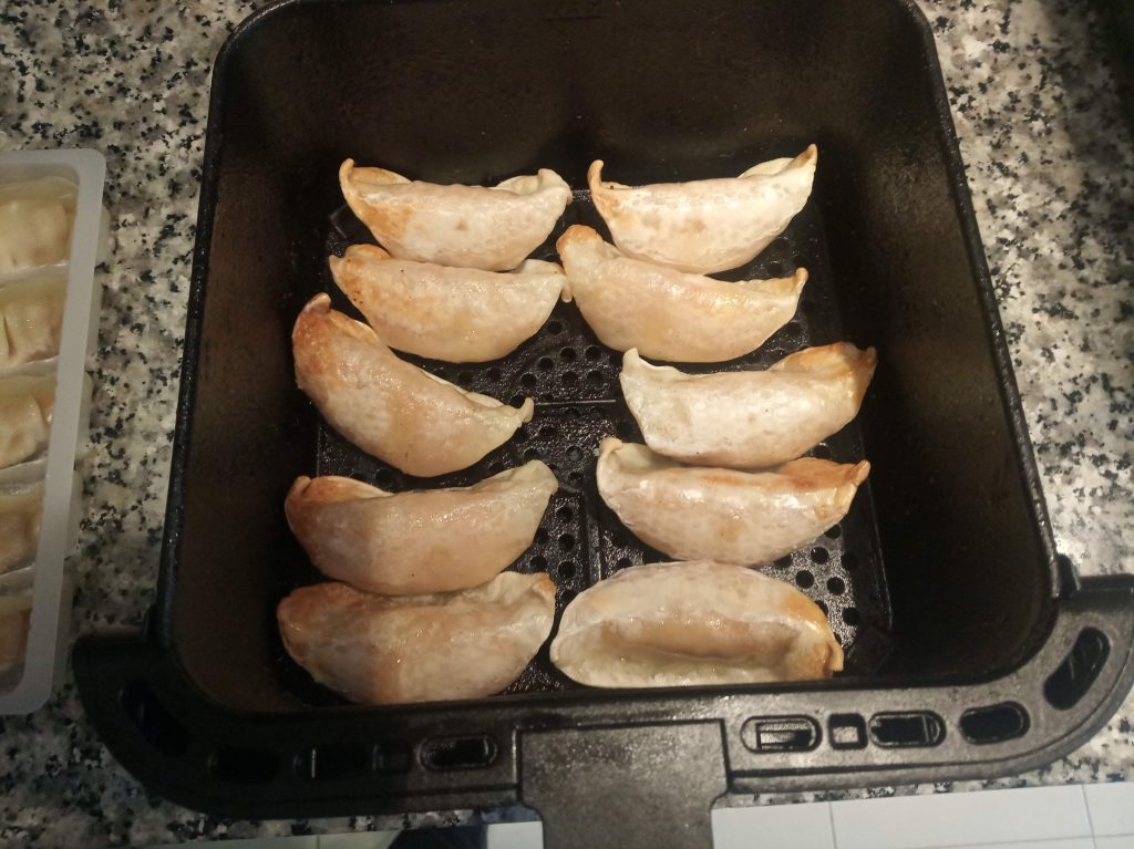 Las Gyozas, las hice congeladas en dos tandas en la freidora de aire, calentar a 200ºC durante 5 minutos, colocar las Gyozas y hacer a 180ºC durante 10 minutos, así las dos tandas.
