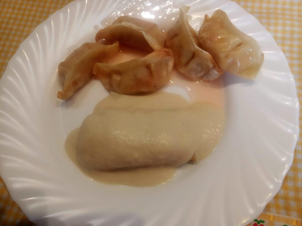 Servir en plato llano, el lomo de merluza, cubierto con bastante salsa de almendra y 5 Gyozas con salsa agridulce.