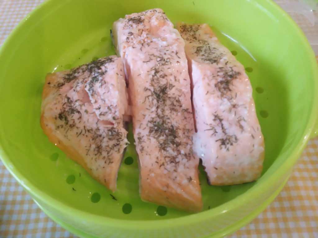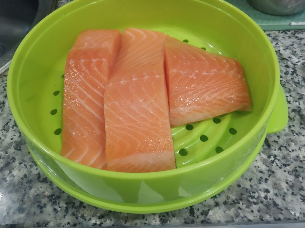 Un poco antes de comer, lavar muy bien, los lomos de salmón, verificar que no tiene espinas.