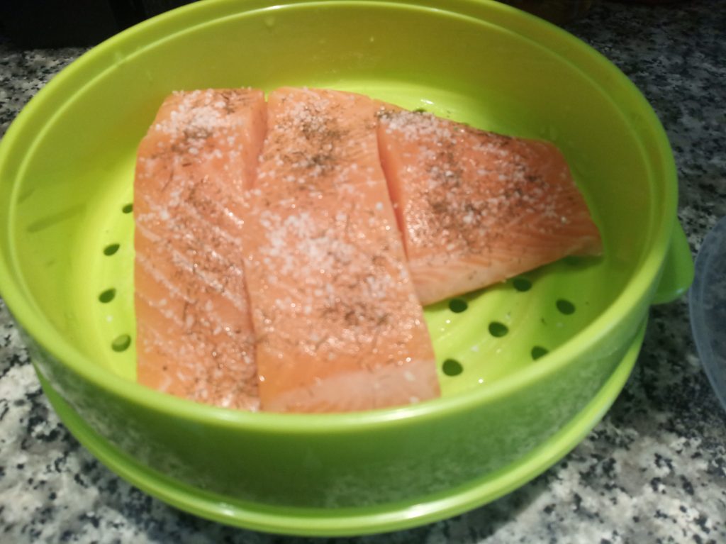 Colocar el plato hondo, si quieres con un poco de agua, y encima la bandeja con agujeros, repartir los lomos de salmón, y echarle un poco de sal y eneldo.