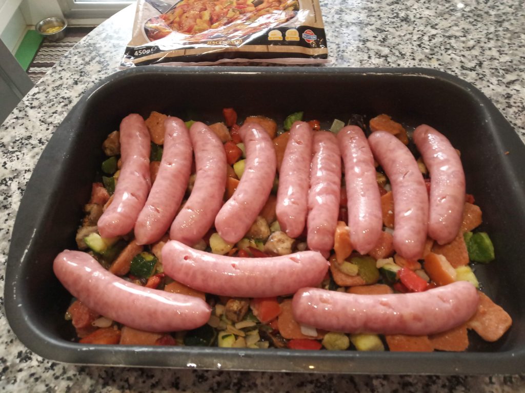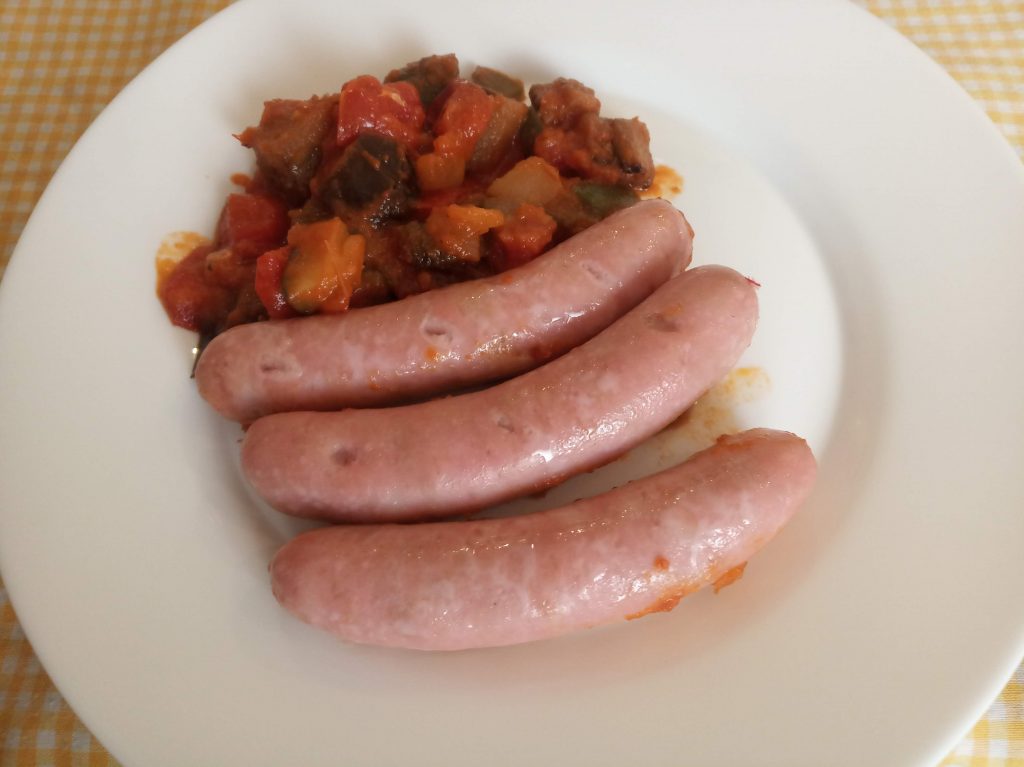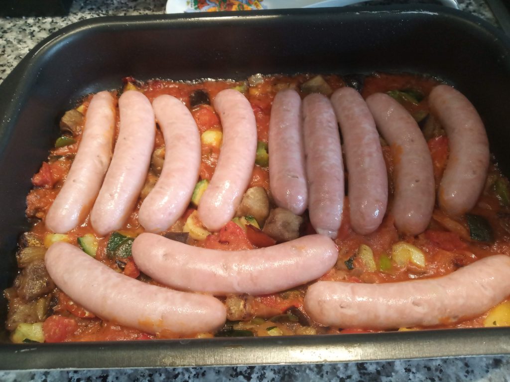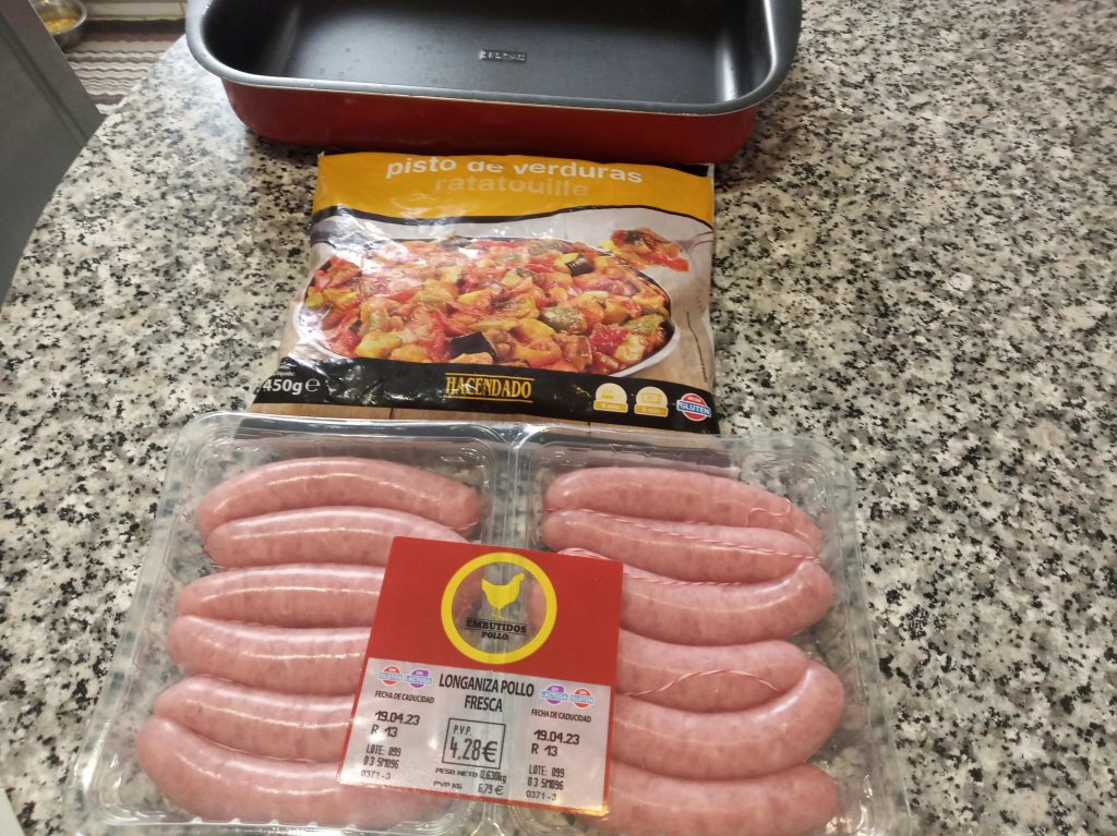 También puedes hacer las longanizas en la Freidora de Aire, si es para 1 o 2 personas, y el pisto en el Microondas o si tienes bandeja para la freidora de aire, puedes hacerlo todo como en el horno.