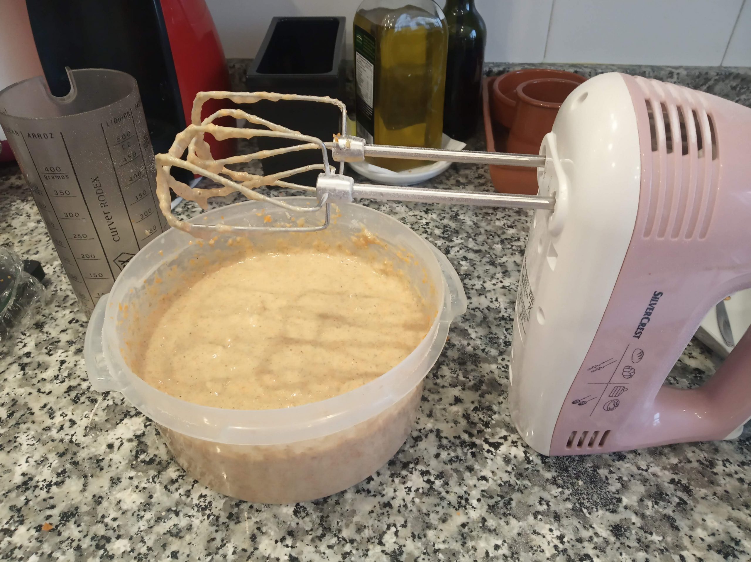 Incorporar la leche, removiendo suavemente, y la zanahoria. Mezclar con movimientos suaves hasta que quede todo bien integrado. Puedes hacerlo todo con el brazo batidor, como hice yo.