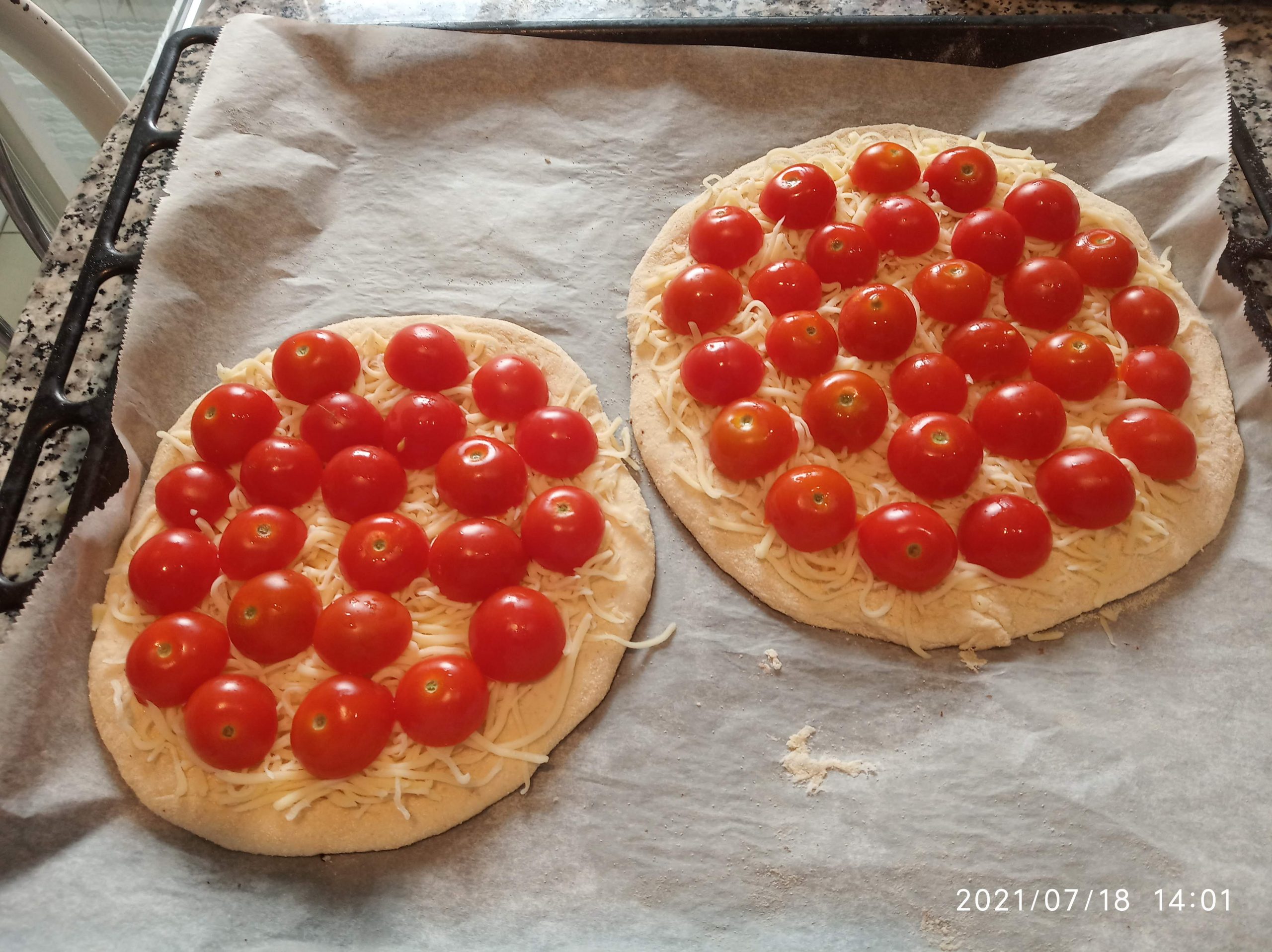 Le eche por encima queso rallado sin lactosa y corte tomates Cherry por la mitad y los coloque con la piel para abajo.