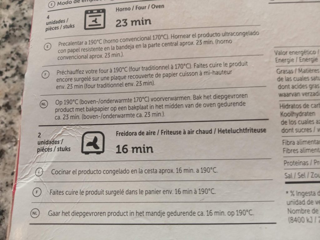 El proveedor te indica como hacerlo también al horno, a 190ºC durante 23 minutos, darle la vuelta unos minutos antes.