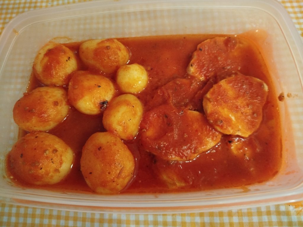 Medallones de solomillos de cerdo con papas cocidas y tomate frito casero