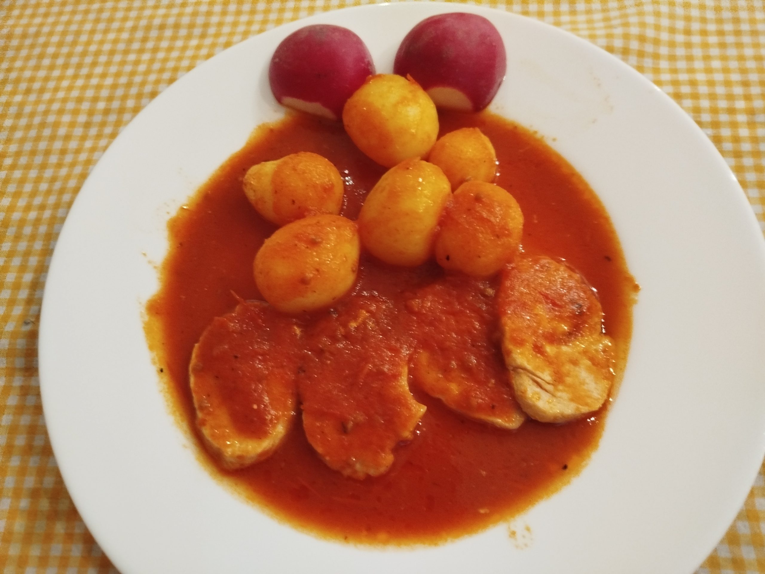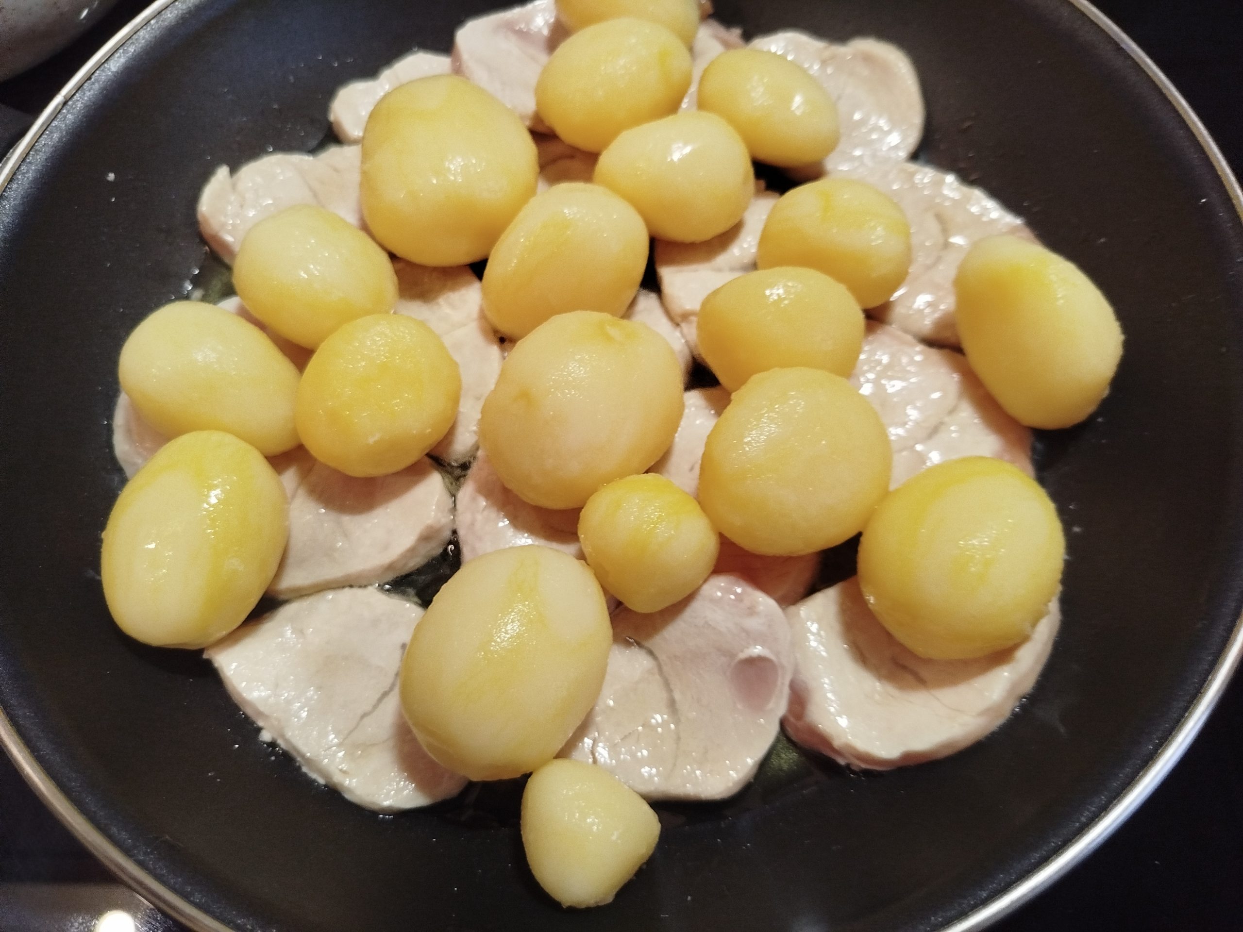 Medallones de solomillos de cerdo con papas cocidas y tomate frito casero