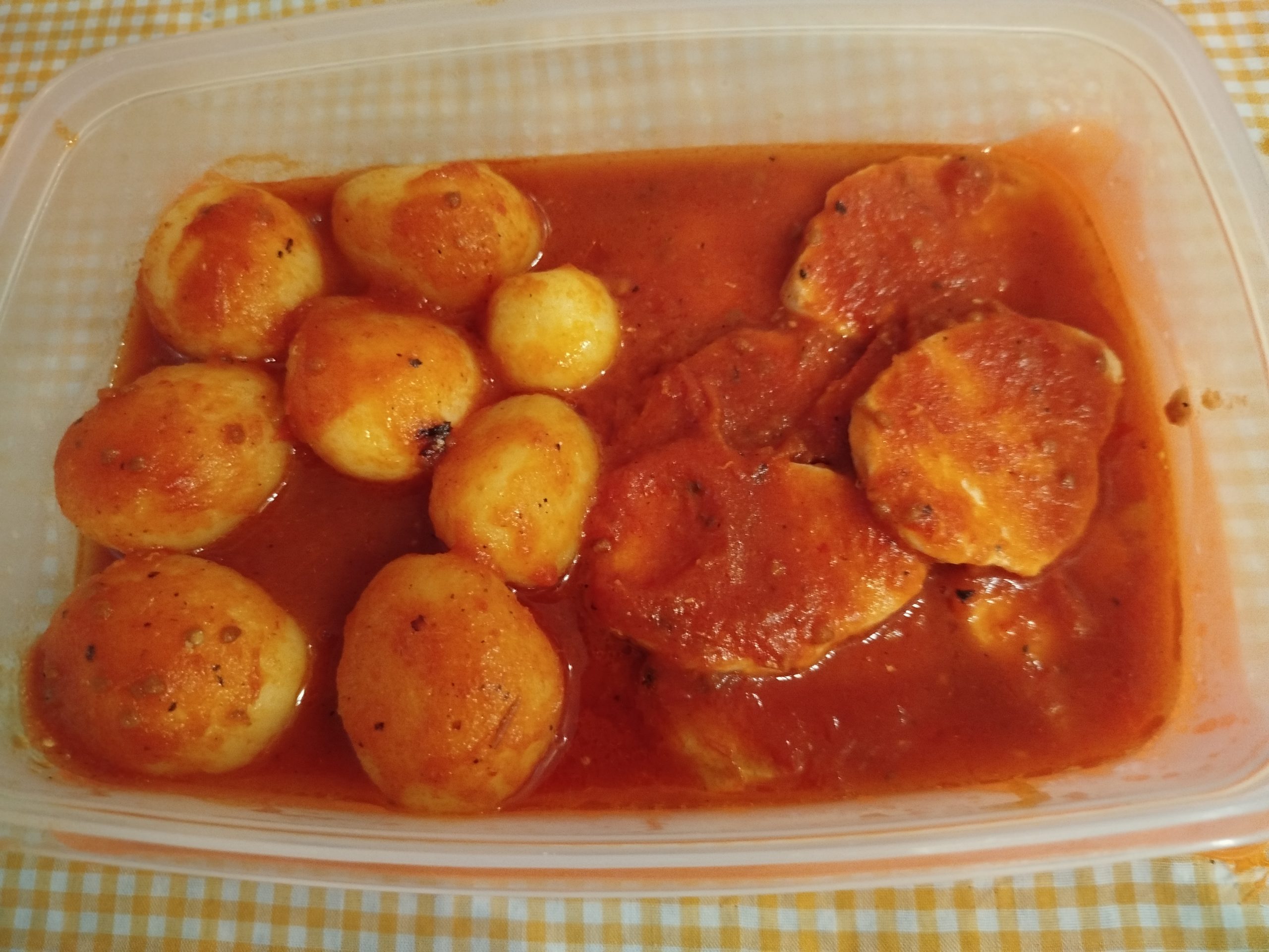 Echar las patatas en un escurridor y lavar muy bien, echar sobre el solomillo y añadir el tomate frito casero, os dejo el enlace a mi receta.