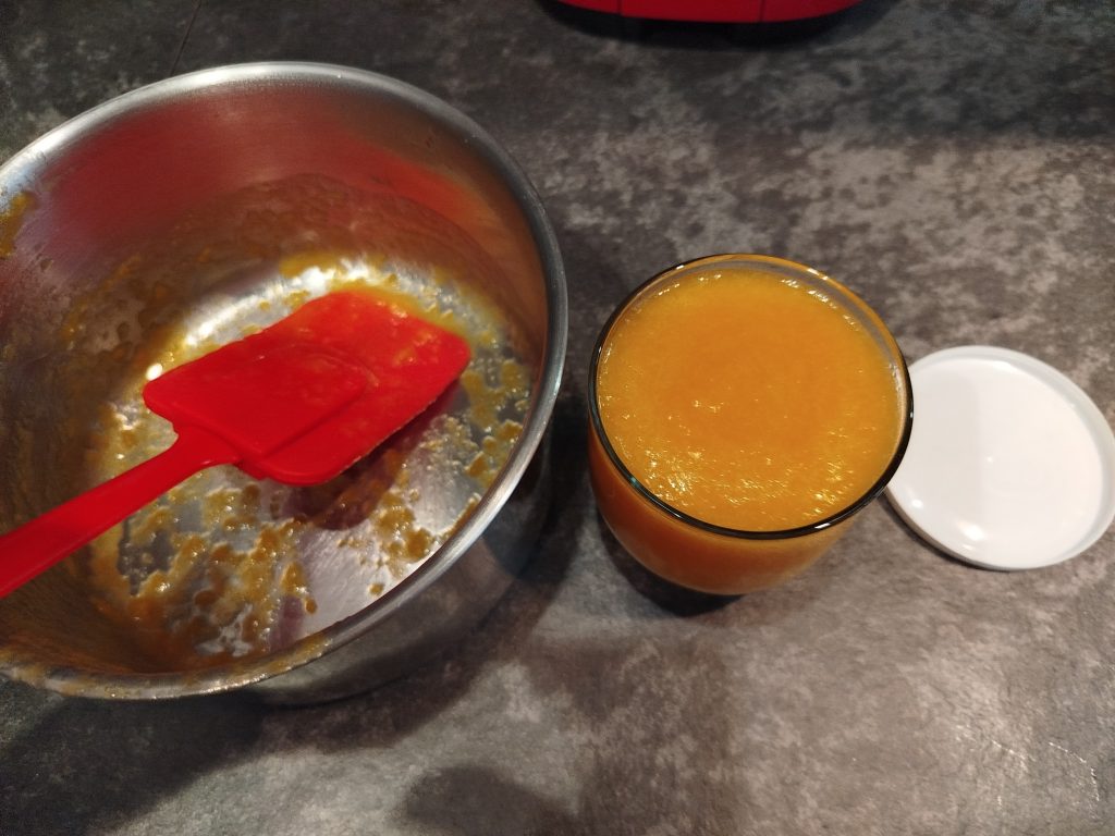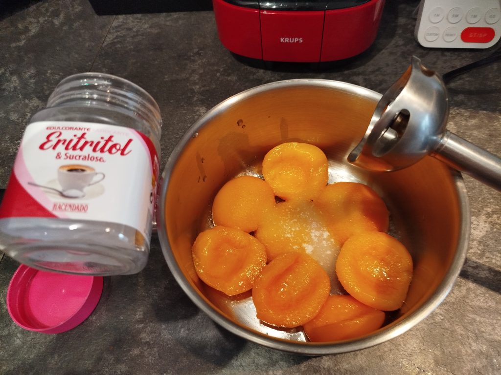 En el mismo cazo, echar las mitades de melocotón escurridas, el Eritritol según la fruta puede necesitar más o menos cantidad probar. Triturar con el brazo de la Minipimer, y dejar a tu gusto.