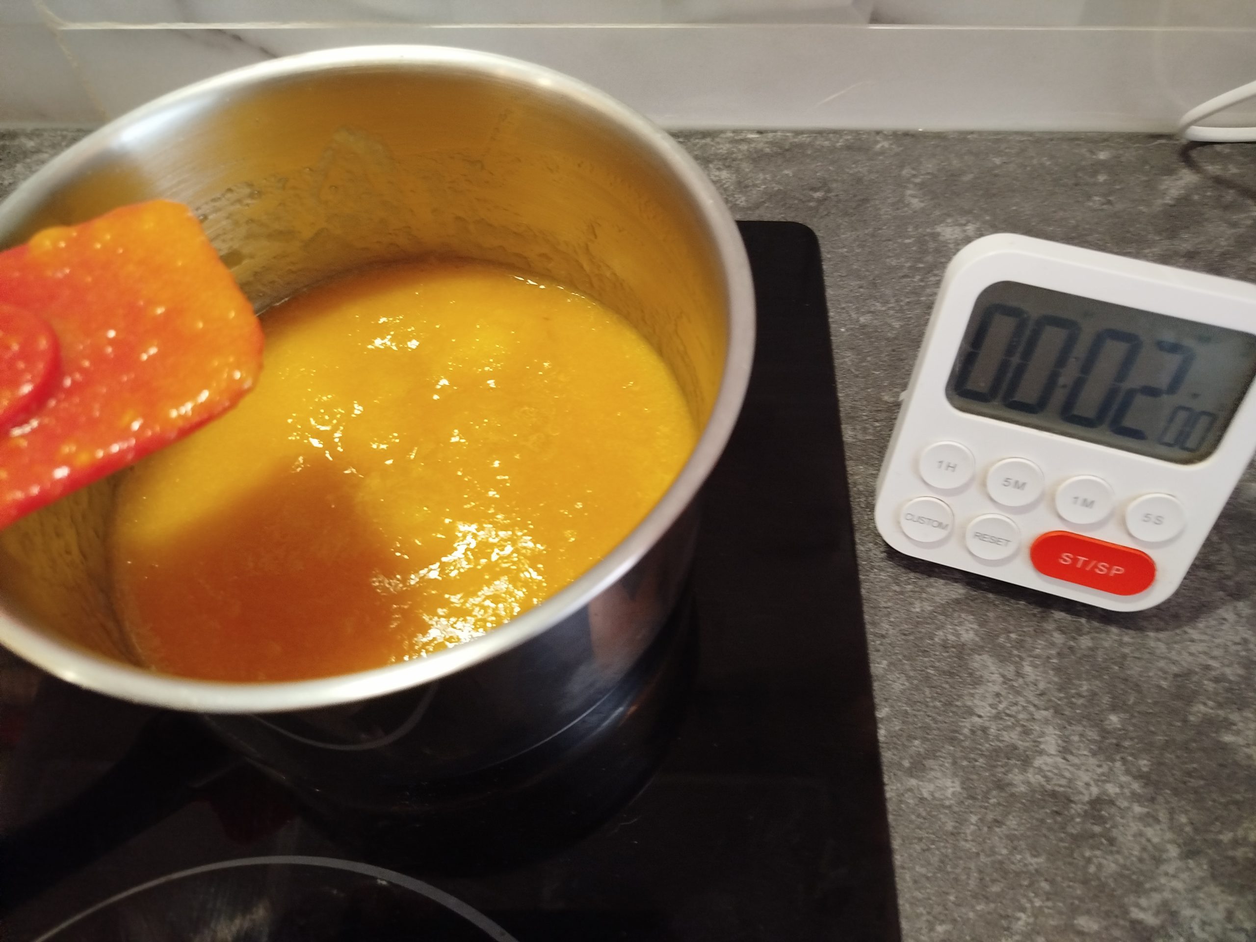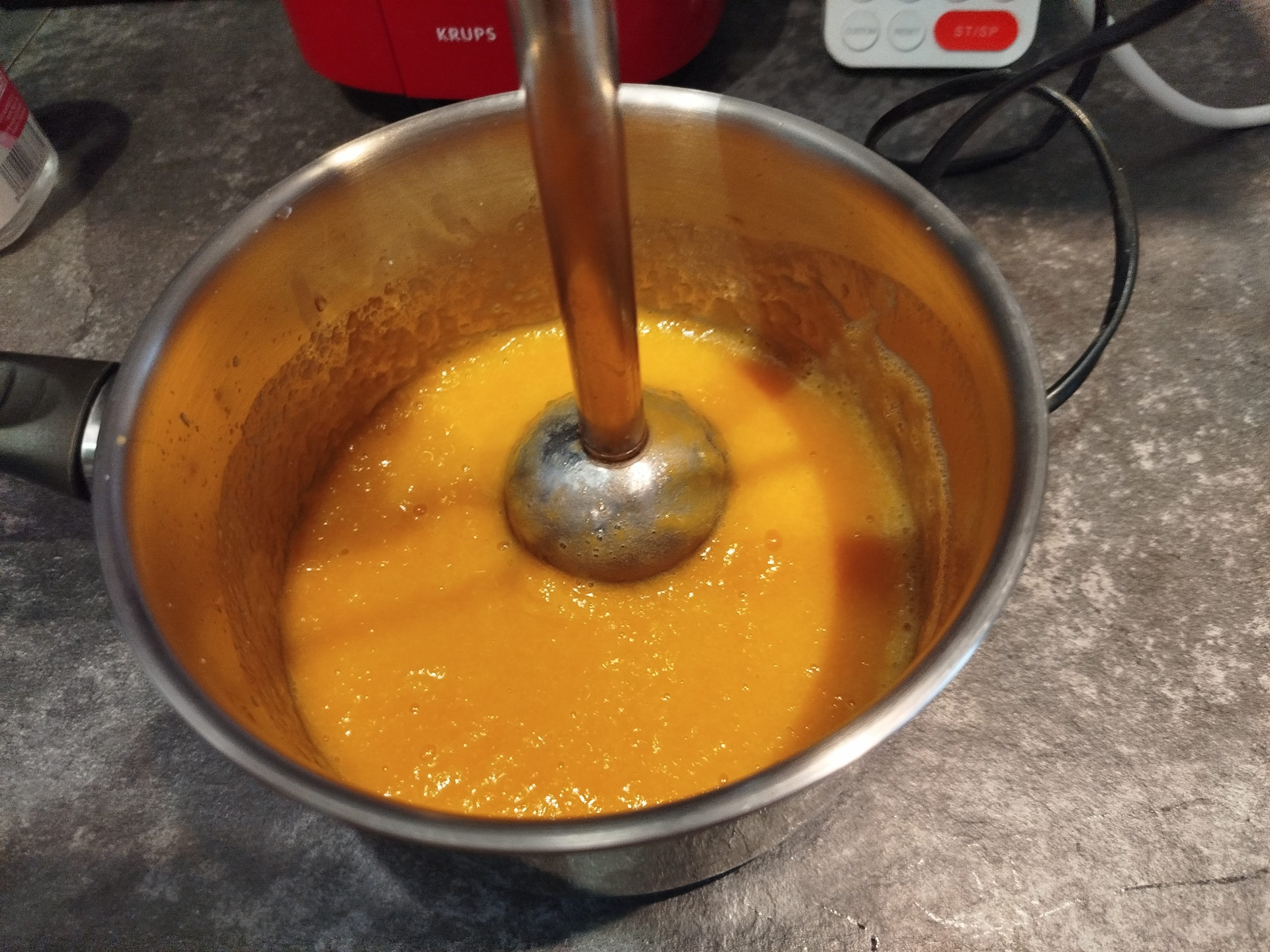 En el mismo cazo, echar las mitades de melocotón escurridas, el Eritritol según la fruta puede necesitar más o menos cantidad probar. Triturar con el brazo de la Minipimer, y dejar a tu gusto.