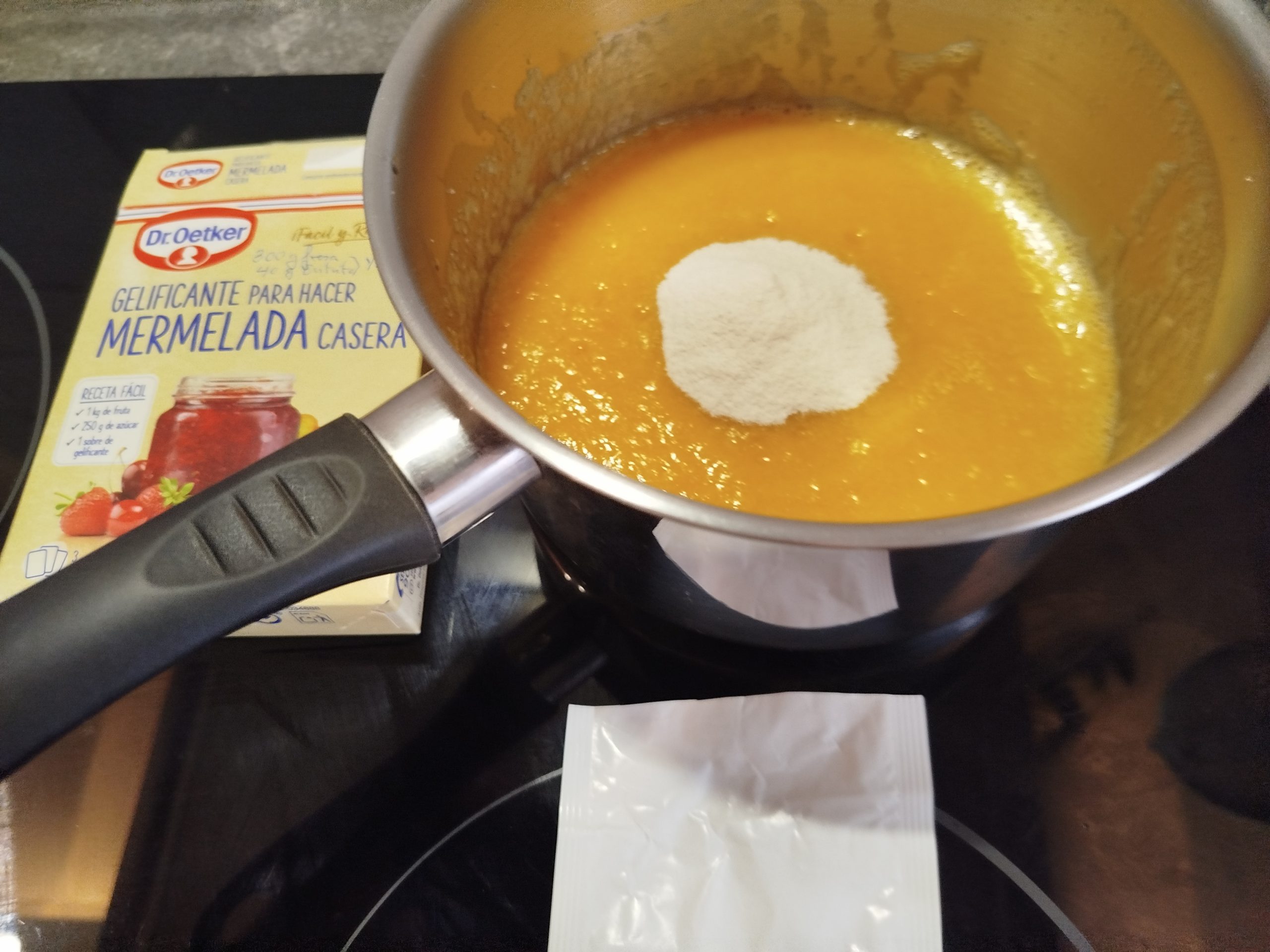 Ponemos el cazo en el calor, le añadimos medio sobre de gelificante, y mezclar todo muy bien, con una espátula de silicona, a fuego bajo, el tiempo que indica el paquete, sin dejar de mover.