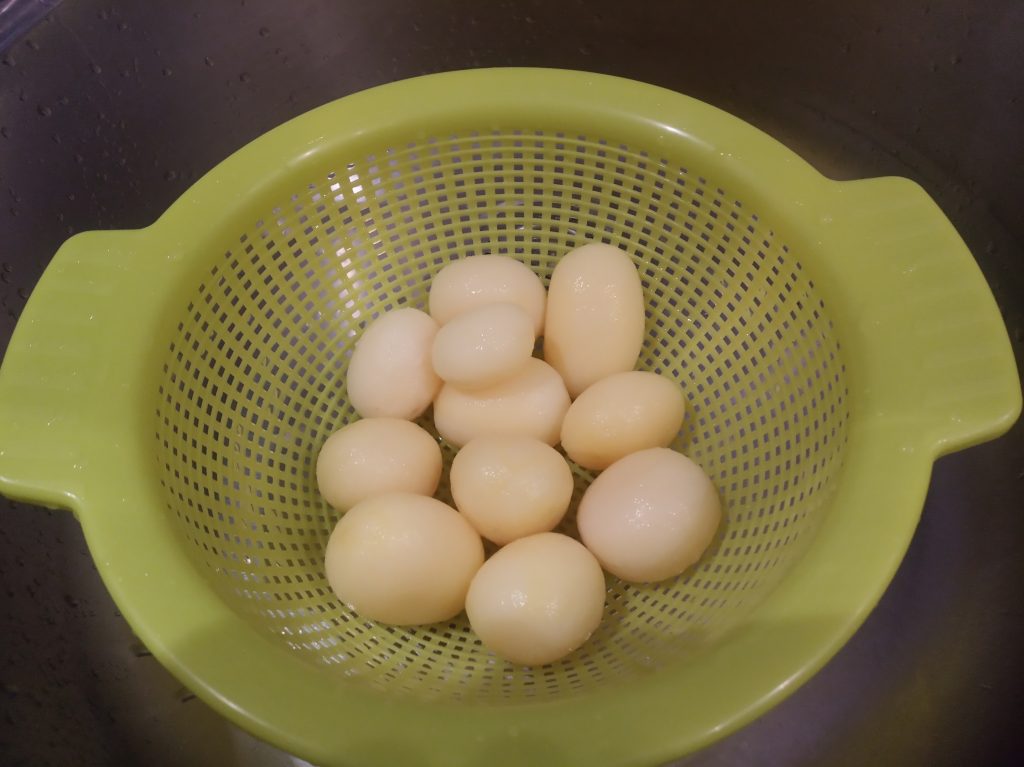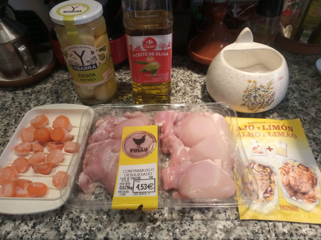 Abrimos el bote de papas cocidas, lo echamos en un escurridor, lavar muy bien, y repartirla a los lados del pollo, echar ½ vaso de agua por encima.
